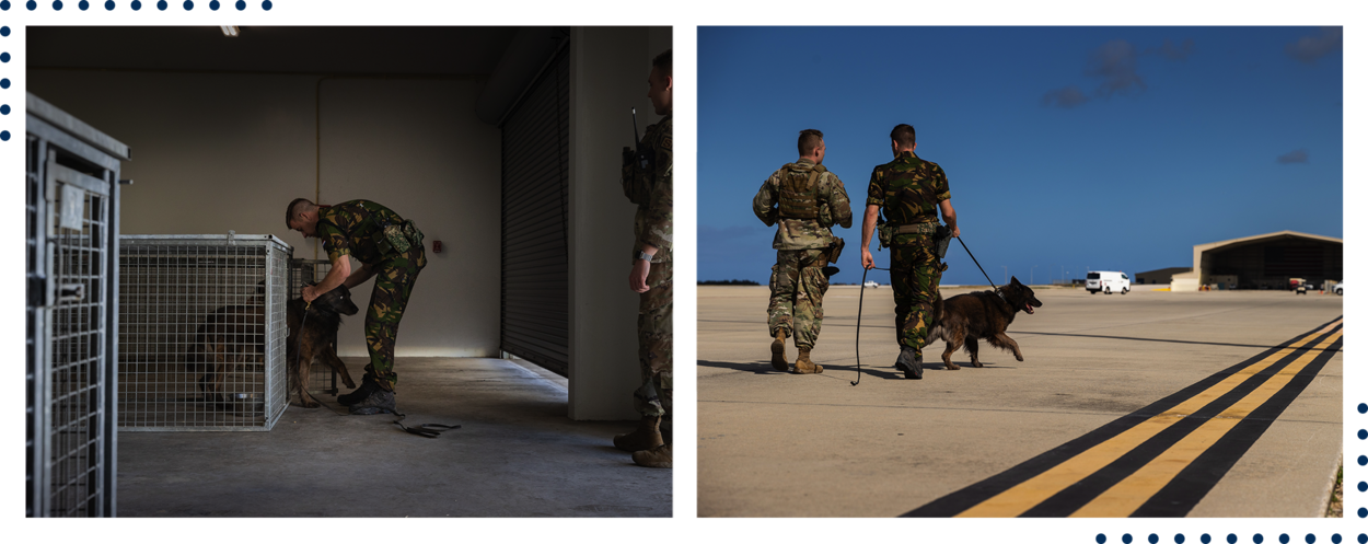Als S3 Ground ben ik hier verantwoordelijk voor de bewaking en beveiliging en daarmee dus mede-verantwoordelijk voor de operationele inzetbaarheid van de Reaper. We patrouilleren 24/7 en lopen met scherp. Dit is geen oefening. Verder is het klimaat een uitdaging. Als mens moet je acclimatiseren, maar als dier ook. De meeste hondengeleiders vlogen voor het eerst met hun hond. Ook dat was spannend, ondanks de kennis en ervaring die we op de hondensectie hebben.