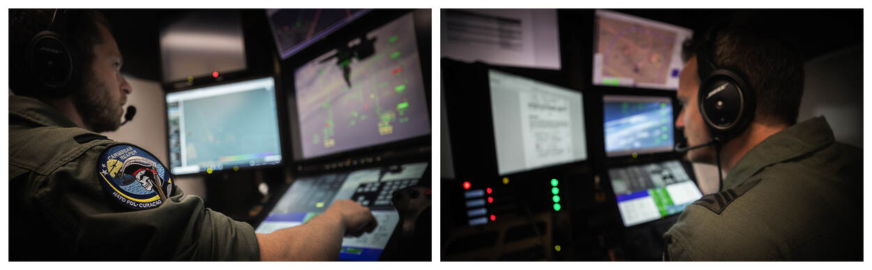 Het onbemande verkenningsvliegtuig, dat volgens de overste minder geluid produceert dan elk ander willekeurig propellervliegtuig, vliegt ruim twee uur door de lucht in de buurt van zijn tijdelijke thuisbasis. Terwijl het grondpersoneel geniet van het uitzicht op ‘hun’ toestel dat een aantal keer voorbij komt, zit de vliegcrew in een container zonder raampartijen naast de flightline. Geconcentreerd stuurt de vlieger samen met de sensoroperator het toestel door het Curaçaose luchtruim. Maar ondanks de serieuze setting en taak zitten majoor-vlieger ‘Hook’ Martin en sensoroperator sergeant 1 Ben met een grijns voor hun beeldschermen. “Súpergaaf”, roept Hook nadat hij na een half uur vliegen de container uitstapt. Hij heeft de throttle zojuist overgedragen aan Bout, vlieger nummer twee. Wisselen van vliegcrew tijdens een vlucht gaat nou eenmaal makkelijker bij een cockpit op de grond. Deze keer valt de eer van de eerste vlucht ten beurt aan liefst víer vliegers.