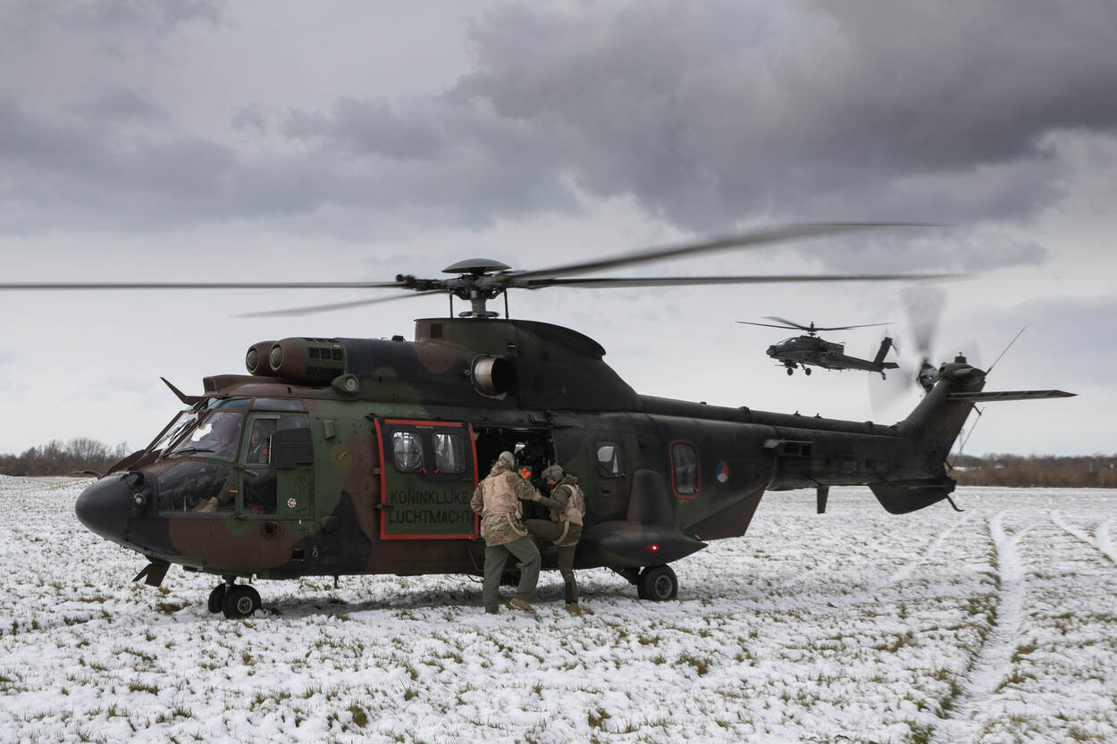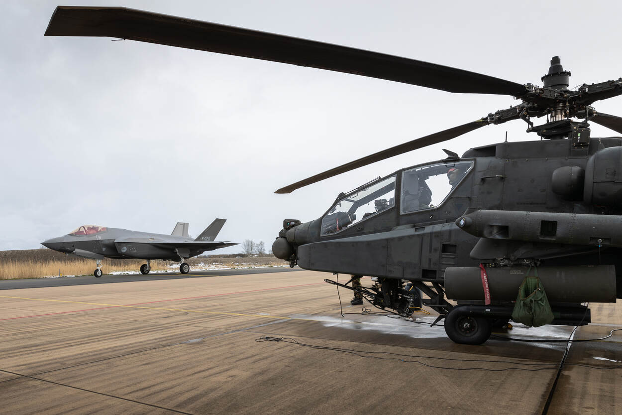 “Dat klopt. Voor het eerst deden er F-35’s mee, maar ook een Cougar en drie Apaches. Samen voerden ze een combatsearch and rescue-missie uit. In het scenario kregen ze te maken met een neergestorte straaljager en een gewonde vlieger. Die persoon moest in veiligheid worden gebracht. Jachtvliegtuigen maakten daarvoor het luchtruim vrij, zodat de Cougar een medische evacuatie kon uitvoeren onder bescherming van twee Apaches. Ook hebben we met Apaches close air support getraind met grondtroepen. Dat trainen we normaal alleen met jachtvliegtuigen. Het voordeel van samen met Apaches opereren is dat zij goed de doelen op de grond kunnen aangeven. Ze kunnen namelijk laagvliegen en goed zien wat er op de grond gebeurt. Ook leggen ze direct contact met de grondtroepen.