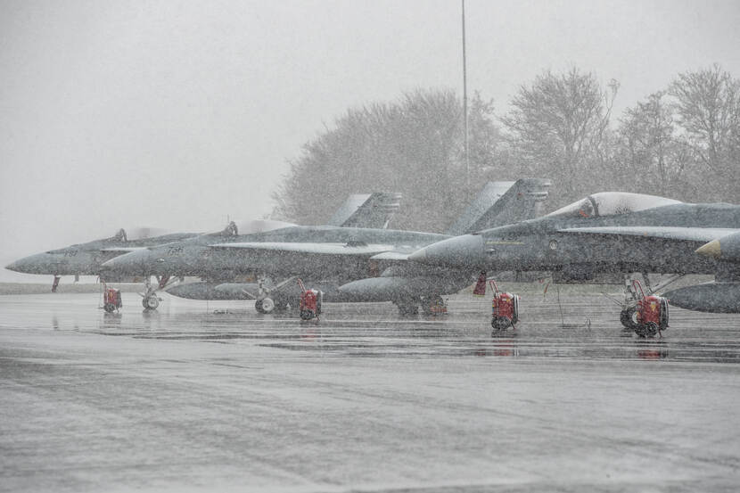 “Het weer was misschien wel de grootste verrassing. Regen, sneeuw en harde wind. En dat terwijl het de drie weken ervoor prachtig weer was. De dagen na de oefening overigens ook. Het was door dat slechte weer niet altijd veilig om te vliegen. Drie geplande waves konden niet doorgaan helaas. De dag na de sneeuwval konden we gelukkig wel weer vliegen. ’s Ochtends hebben we de platformen en vliegtuigen schoongemaakt volgens het sneeuw- en ijsbestrijdingsplan. Dat was een taak die er dus extra bij kwam.”