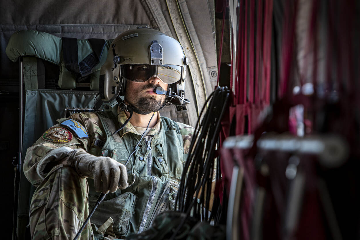 Voor de Chinook is de zogenoemde ridgeline een van de belangrijkste technieken om te oefenen. Met alleen de achterwielen en laadklep rustend op de rotsen zet je al hoverend troepen en materieel op moeilijk toegankelijke plekken af. Doordat je in de cockpit niet precies ziet waar je landt, is bij deze methode de hulp van de loadmaster onontbeerlijk. Hangend uit de zijdeur geeft hij of zij aanwijzingen waar precies de wielen terecht moeten komen. Jeroen vertelt dat het belangrijk is dat je bij het uitvoeren van een ridgeline rondom veel vrije ruimte hebt. En dat je het toestel zo stil mogelijk houdt. “Dat gebeurt volledig met de hand. Zodra de wielen aan de grond staan, schakelt de automatische piloot zichzelf uit.”