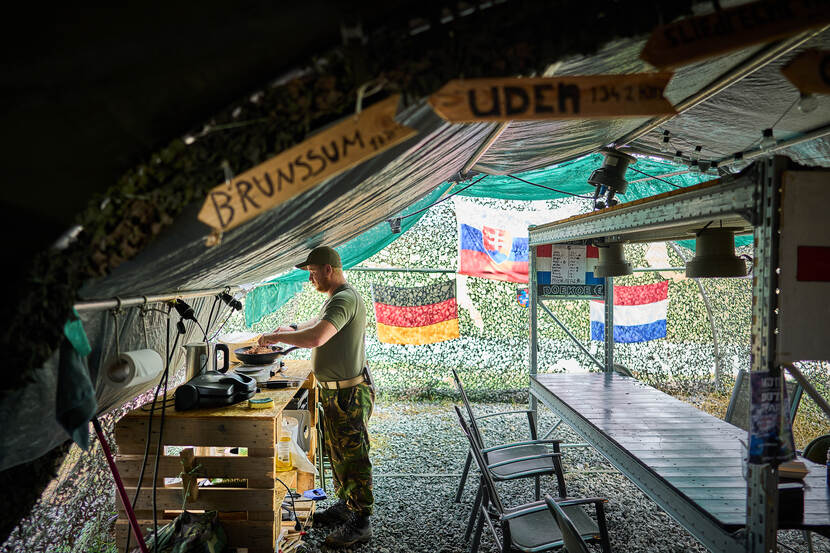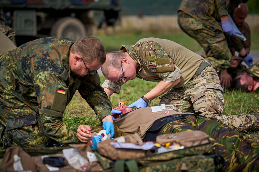 De samenwerking reikt verder dan luchtverdediging. Bij de mannen van Herstel (onderhoud en reparatie van materieel) lopen de nationaliteiten door elkaar heen. Bij de Role 1 is dat niet anders, vertelt sergeant 1 Michel, algemeen militair verpleegkundige. Duitse en Nederlandse genezerikken van de landmacht schieten gezamenlijk te hulp bij eventuele grote calamiteiten. “Aan het begin hebben we duidelijke afspraken gemaakt; wie doet wat en wanneer? Daarnaast trainen we gezamenlijk en delen we materieel.” Wijzend naar een kniebrace van een luchtmachter, zegt hij: “Die komt van onze Duitse collega’s.” Kortom: “De samenwerking gaat heel goed.”