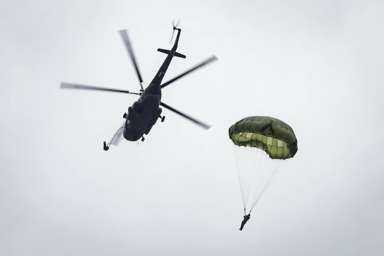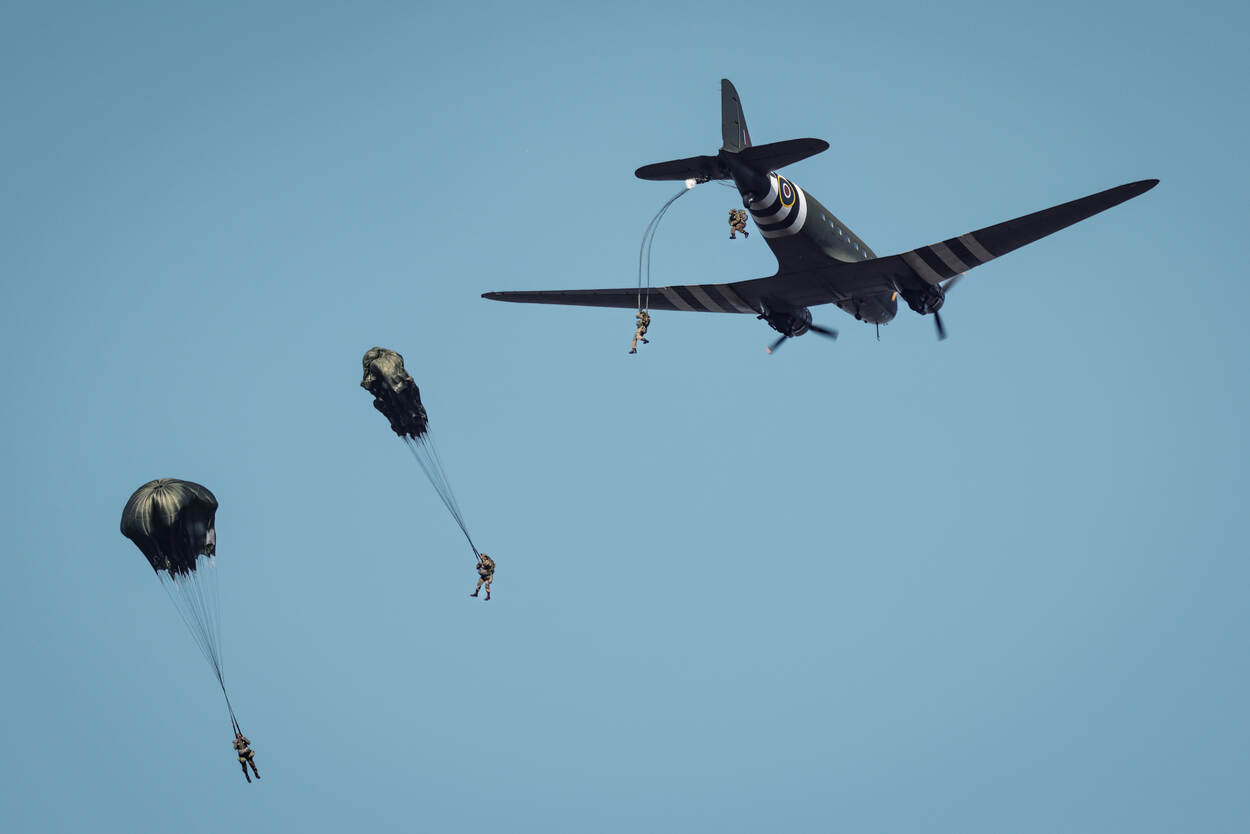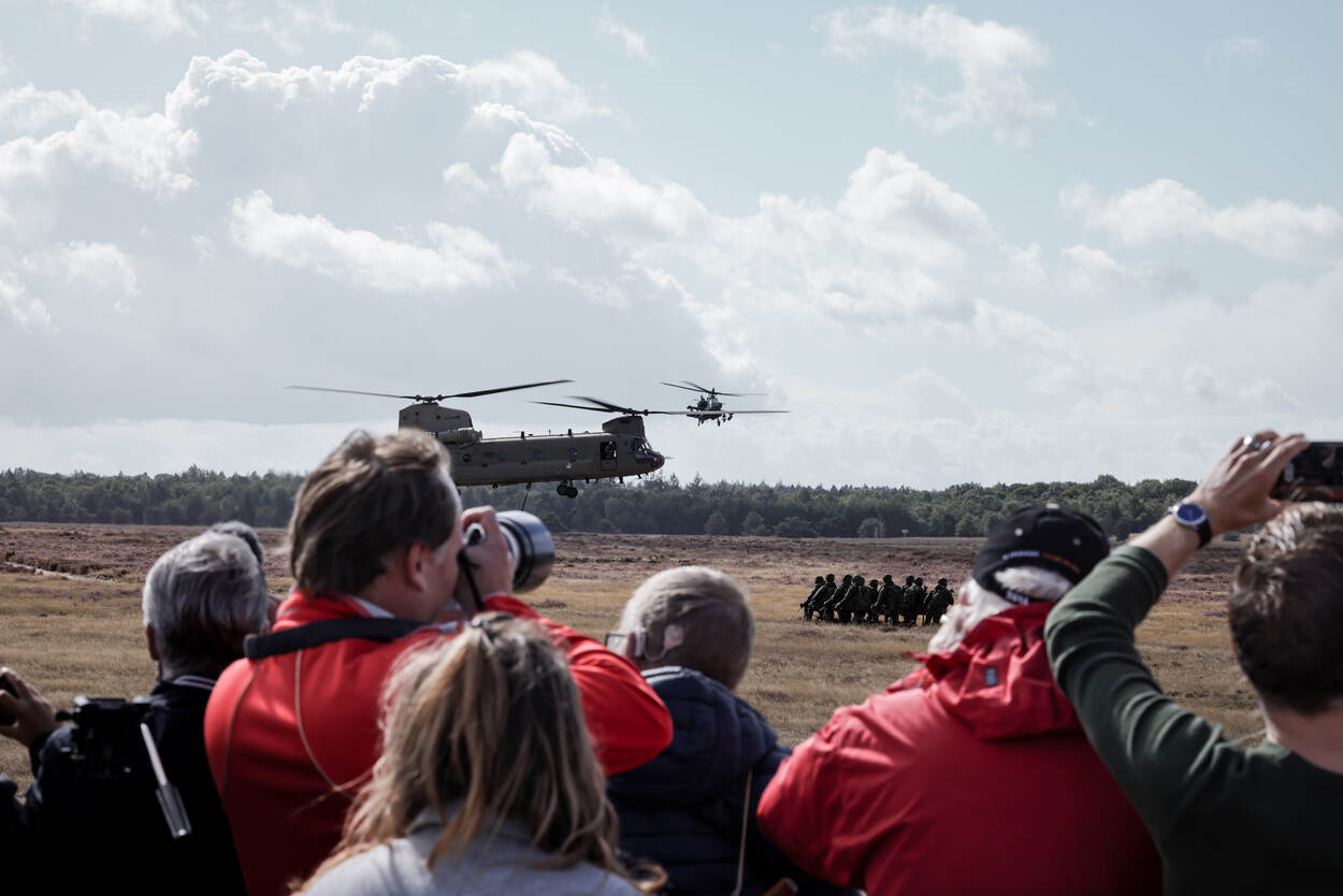 Na de oefening vond op 17 september de jaarlijkse herdenking van operatie Market Garden boven de Ginkelse Heide in Ede plaats. Het is 78 jaar geleden dat deze operatie plaatsvond. Militairen van 11 Luchtmobiele Brigade en internationale collega’s sprongen ook bij deze herdenking onder meer uit een civiele C-47. Met deze ‘Dakota’s’ vond een groot deel van de luchtlandingen in 1944 plaats. Het Defensie Helikopter Commando gaf op Ginkel ook nog een demonstratie. Foto’s: korporaal 1 Barend Westerveld en korporaal Hilbert Buter, 11 Luchtmobiele Brigade