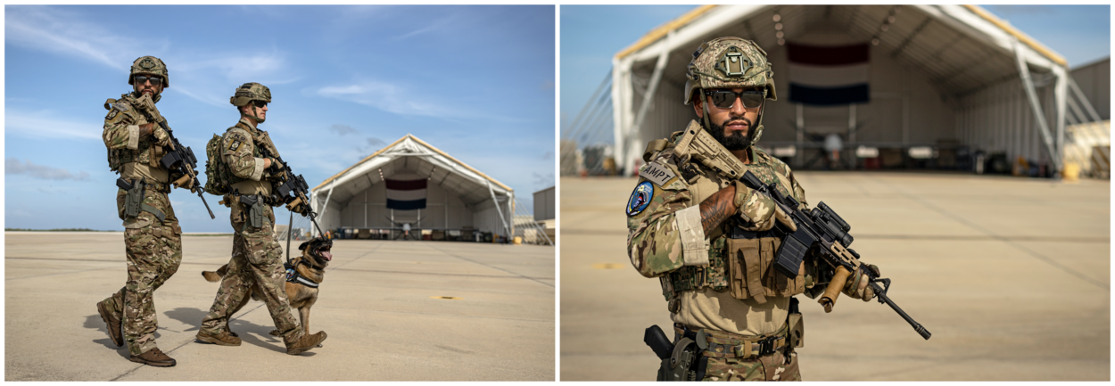 Het is nog vroeg in de ochtend als de hangar met twee MQ-9’s na een regenachtige nacht opengaat. Er kan worden gevlogen. Hondengeleider sergeant Nic met de Mechelse herder Spike en korporaal 1 Rowan van de Object Grondverdediging (OGRV)-Zuid houden een oogje in het zeil. “Een prachtbaan”, omschrijft oud-landmachter Nic zijn werk. Het is een van de laatste opdrachten voor de nog altijd speelse Spike (bijna negen jaar oud) die na meer dan zes jaar trouwe dienst met pensioen mag. Baasje en hond hebben een enerverende geschiedenis samen. “We zijn net terug uit Mali. Daarvoor heeft onze vlucht nog geholpen in Pakistan bij de evacuatie van Nederlanders uit Afghanistan en bij de bosbranden in Albanië. Het is veelzijdig werk en we hebben er allebei plezier in.” En straks? “Spike blijft bij me en ik neem geen nieuwe hond aan. Maar ik blijf zeker bij de OGRV.”