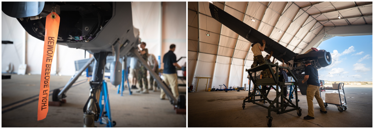 Ondertussen is de MQ-9 vlieggereed gemaakt door een aantal Amerikaanse specialisten en niet te vergeten sergeant-majoor Roelof. Een onderdeel dat moet worden vervangen is binnen, maar de papieren zijn nog niet rond. Hij is de spin in het web; de liaison tussen operaties en onderhoud, dat wordt uitgevoerd door een handjevol Amerikaanse contractors. “Hier gaat het wel even anders”, zegt hij. Voorheen was hij namelijk wapentechnicus op de F-16. “Dan gingen vier of zes toestellen de lucht in en stond er honderd man klaar op de grond om alles te regelen. Maar prachtig werk. Mij hoor je verder niet klagen.”