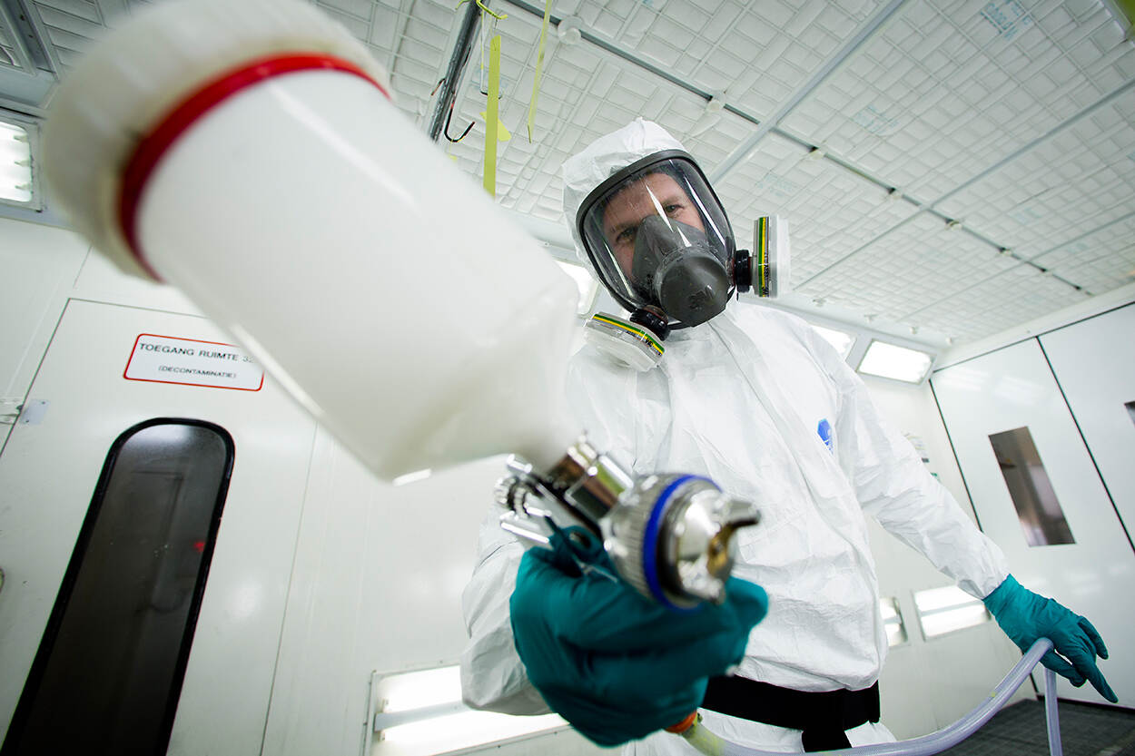 Het gebruik van deze middelen is wel noodzakelijk, onder meer vanwege hun roestwerende eigenschappen. De nieuwe spuitcabines op Volkel, Eindhoven en De Kooy zijn volgens planning in 2023 gereed en die op Leeuwarden in 2024. Foto: Archiefbeeld Mediacentrum Defensie