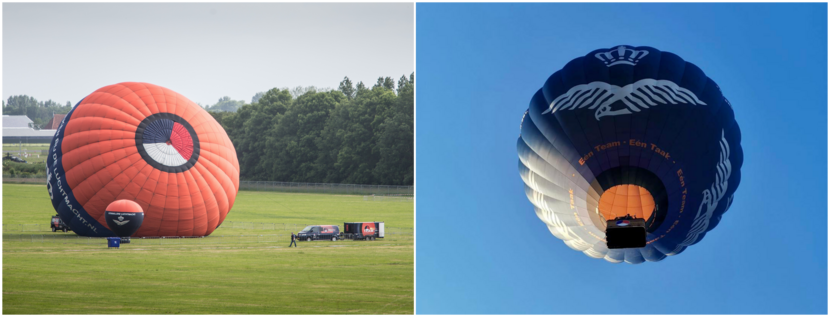 Beide ballonnen zijn nog in bezit van de luchtmacht, al wordt de SBB gezien de leeftijd vooral nog gebruikt voor static displays op bijvoorbeeld open dagen. De KLu-ballon maakt zo’n veertig vaarten per jaar. Foto links: sergeant Sjoerd Hilckmann, foto rechts: Facebook KLuBallon