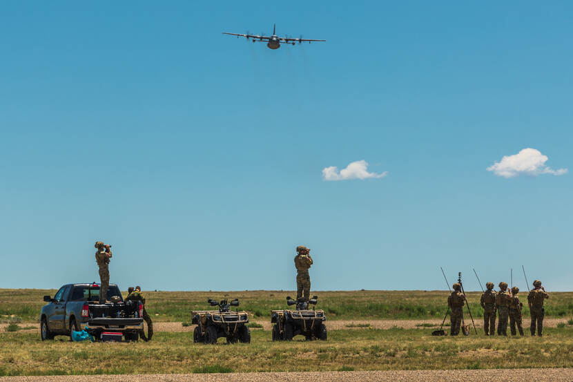 Ondanks dat de Nederlandse C-130’s niet vlogen, werden de vluchten en routes door 336 wel gepland, zo werd er toch trainingswaarde uit de oefening gehaald. Afgelopen zomer kon 336 wel geïntegreerd oefenen met landmachteenheden. Dat gebeurde toen voor het eerst in Colorado tijdens Mountain Bull (foto). In maart staat er weer een Orange Bull op het programma. Foto: sergeant-majoor Cristian Schrik