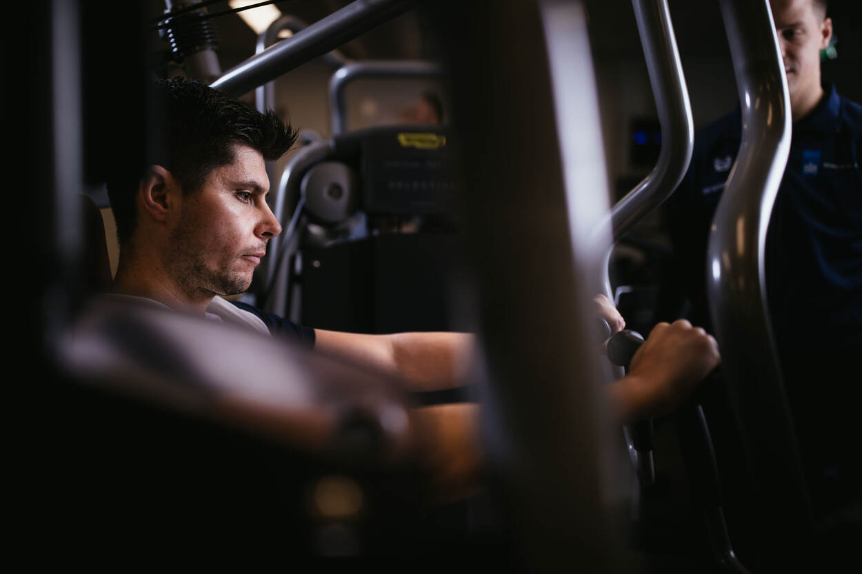 Door mijn blessure moet ik dit traject langzaam opbouwen. Onder begeleiding breng ik dan het aantal herhalingen per set omlaag en het trainingsgewicht omhoog. Ik sport dus nog lekker even verder!”