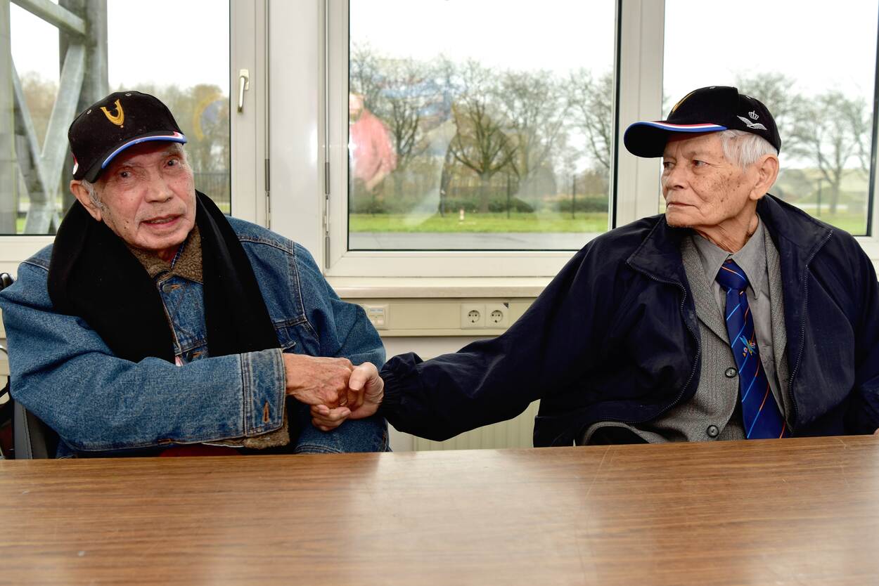 Een generatie later staan Beer Heitinga (72) en Franky Benthem (70) gearmd op de Vliegbasis Gilze-Rijen. Hun vaders waren goed bevriend. Je stelt je voor dat ook de dan nog jonge Joop en zijn sobat (vriend) Jan Benthem tussen 1947 en 1949 ooit zo hebben gestaan, broederlijk bij elkaar ver weg van huis en haard. Beer: “Franky heeft uitgezocht dat onze vaders recht hadden op het Ereteken Orde en Vrede. En dan is het helemaal mooi dat het hier kan. Wat een geweldige plek, zo vlakbij een type toestel waarin zij misschien ooit wel samen hebben gevlogen.”