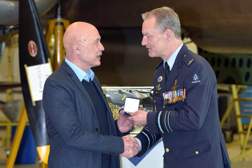 De decoratie is zojuist, in bijzijn van broers, kinderen en kleinkinderen, aan hem uitgereikt door Commandant Luchtstrijdkrachten (C-LSK) luitenant-generaal Dennis Luyt. Postuum dus voor zijn vader Joop, eind jaren veertig radiotelegrafist bij het 18 Squadron van de Militaire Luchtvaart van het Koninklijk Nederlandsch-Indisch Leger (ML-KNIL).