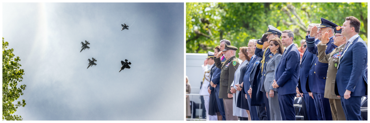 Onder anderen minister van Defensie Kajsa Ollongren en Commandant der Strijdkrachten generaal Onno Eichelsheim waren aanwezig. De herdenking met diverse kransleggingen werd traditiegetrouw afgesloten met een missing-man formatie boven de begraafplaats. Die bestond in dit geval uit twee F-16’s en twee F-35’s van de luchtmacht. Eén F-35 verliet boven de begraafplaats de formatie als symbool voor de gevallenen.