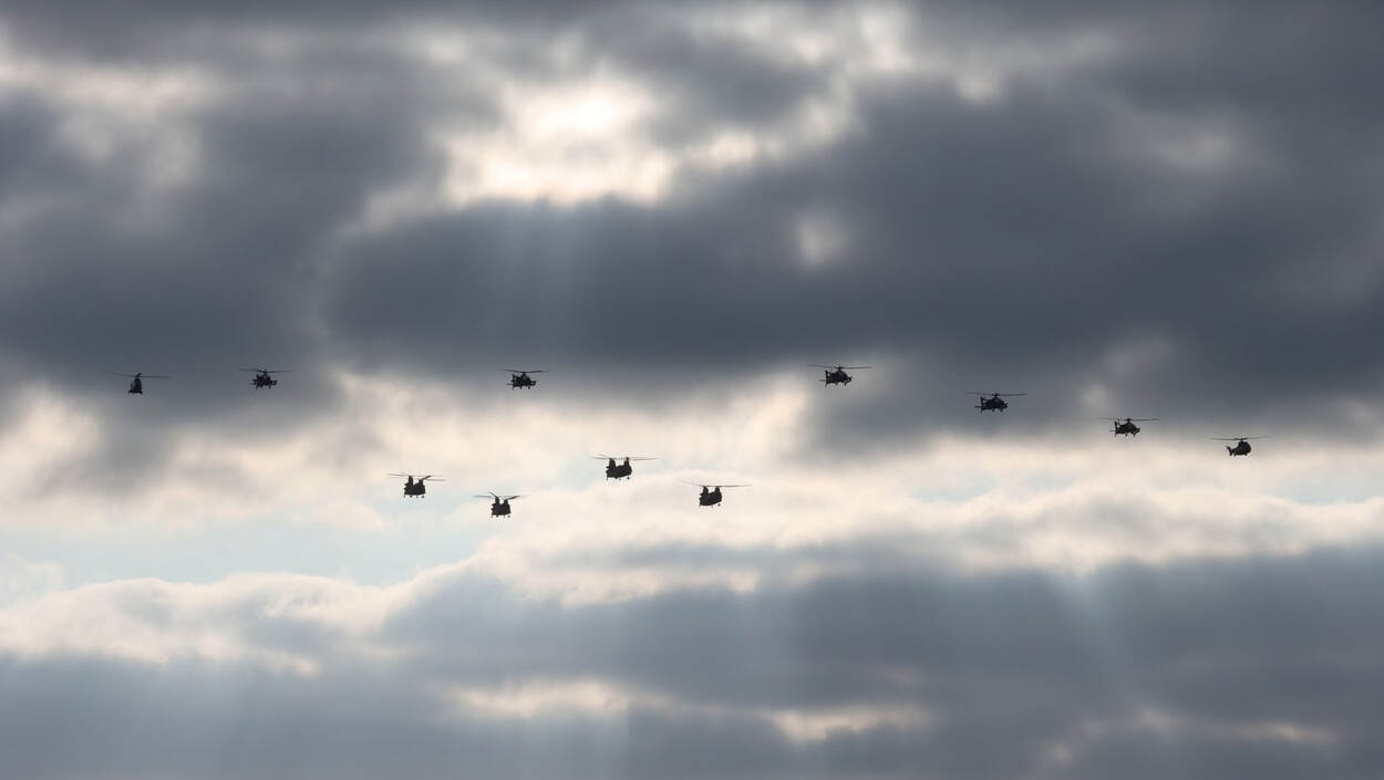 Een beeld dat je niet vaak ziet: elf toestellen van het Defensie Helikoptercommando (DHC) in formatie. De Apaches, Chinooks en Cougars kwamen op 2 juni terug van de drieweekse oefening TAC Blaze in Groot-Brittannië.
