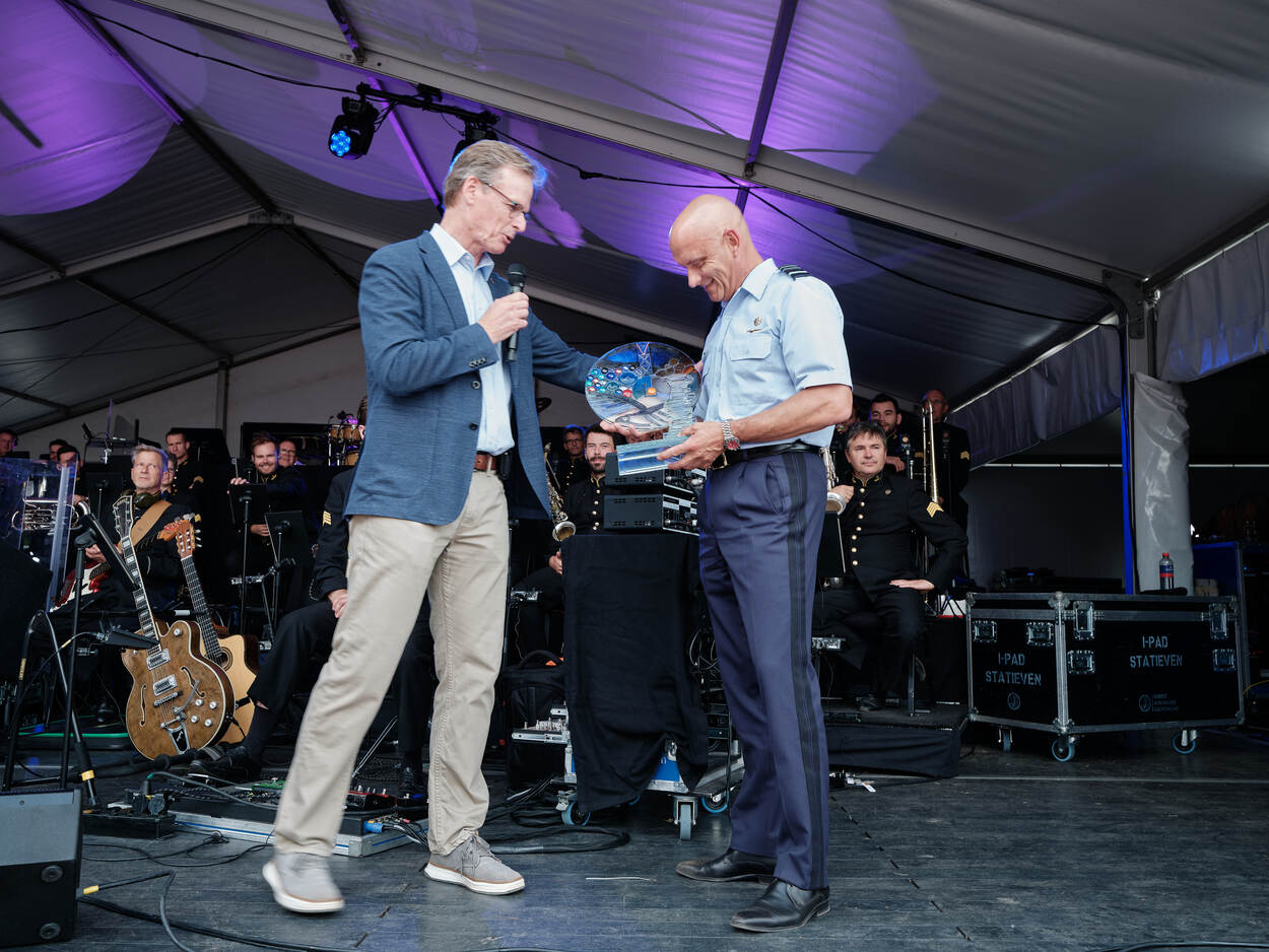 Bij een verjaardag hoort ook een cadeau. De KNVOL is er voor de luchtmacht en daarom had de kersverse voorzitter commodore b.d. ir. Marcel Lambrichs een aandenken meegenomen voor C-LSK Steur.