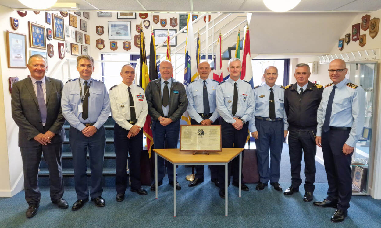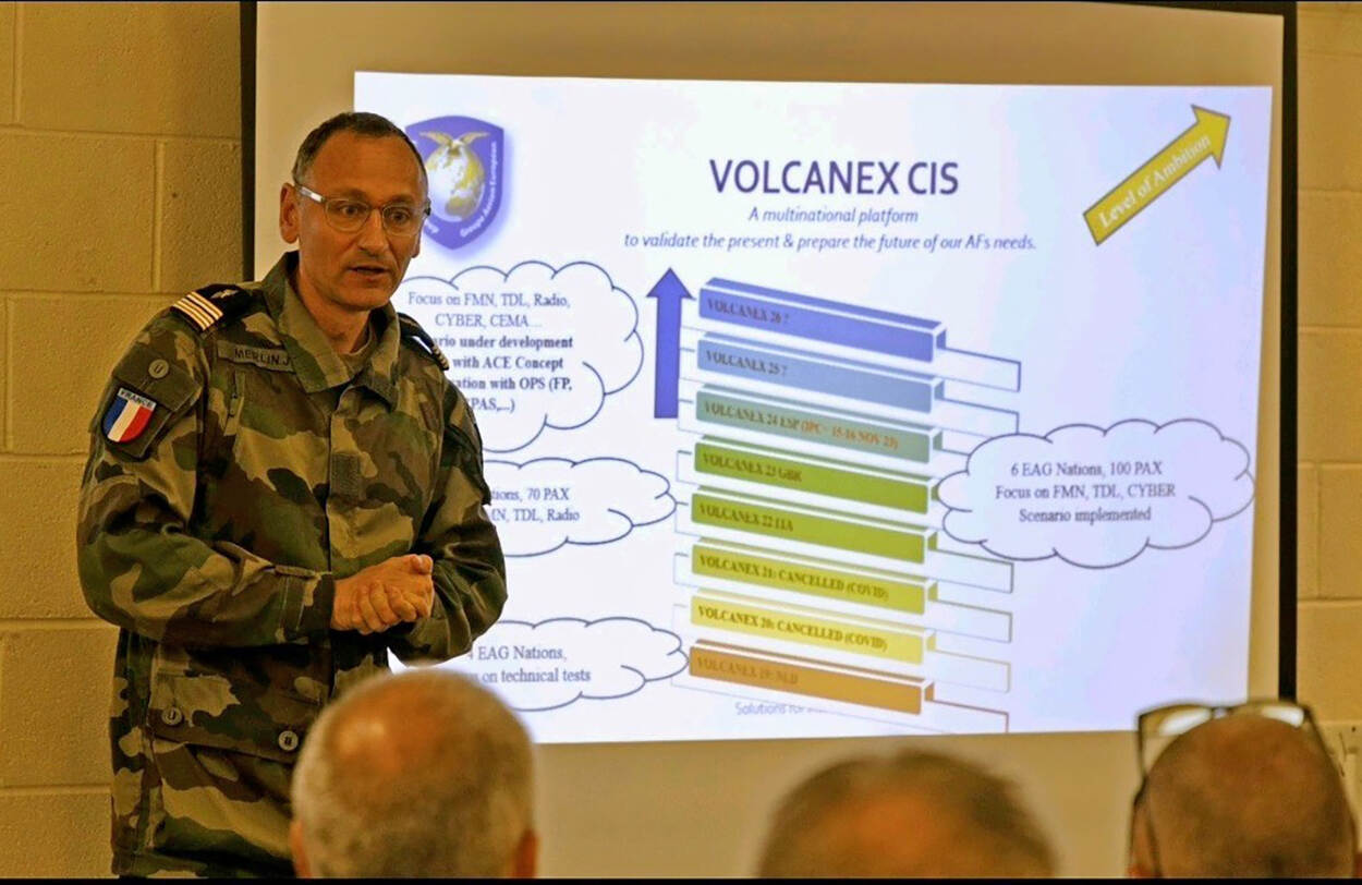 De Volcanex-oefeningen vallen onder de vlag van de European Air Group, die dit jaar 25 jaar bestaat. Het is een onafhankelijk samenwerkingsverband van zeven donorlanden: België, Duitsland, Frankrijk, Italië, Nederland, Spanje en het Verenigd Koninkrijk. Jaarlijks komt de stuurgroep van de zeven air chiefs van de landen bijeen, waarbij een van hen de rol van Directeur EAG heeft. Tot eind dit jaar is dat de Commandant Luchtstrijdkrachten luitenant-generaal André Steur (midden op de foto).