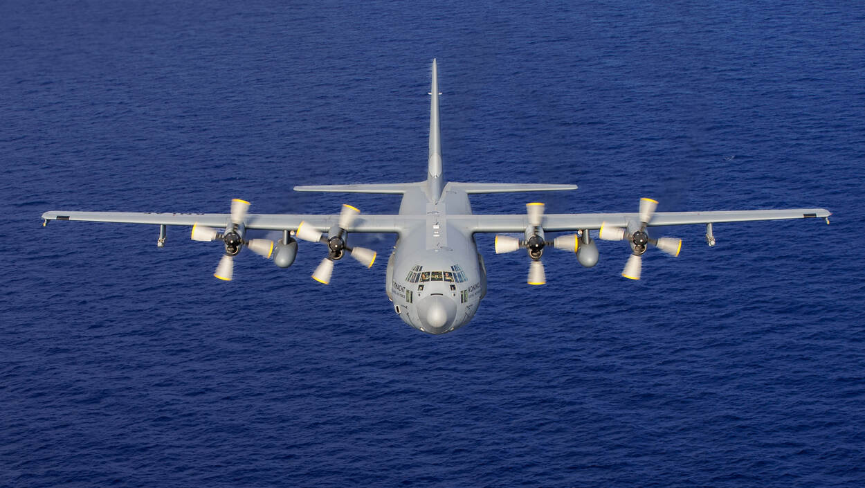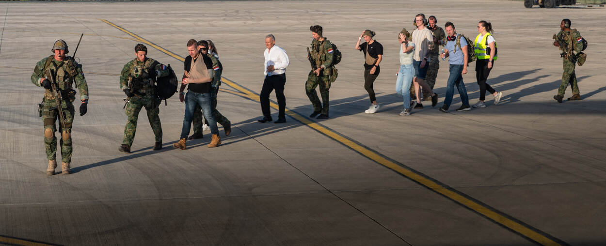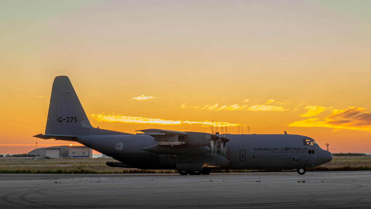 Een van de beide loadmasters van de C-130 van 336 Squadron steekt zijn duim omhoog naar de wachtende mariniers op het platform: ze mogen instijgen. Tientallen mariniers met zware bepakking lopen in twee rijen het transporttoestel in. Zij worden even later afgezet op een ‘luchthaven in de regio’ om een evacuatieoperatie uit te voeren van een specifieke doelgroep die zelf het betreffende land niet meer kan verlaten. Net zoals bijvoorbeeld in werkelijkheid gebeurde in Soedan en Kaboel.