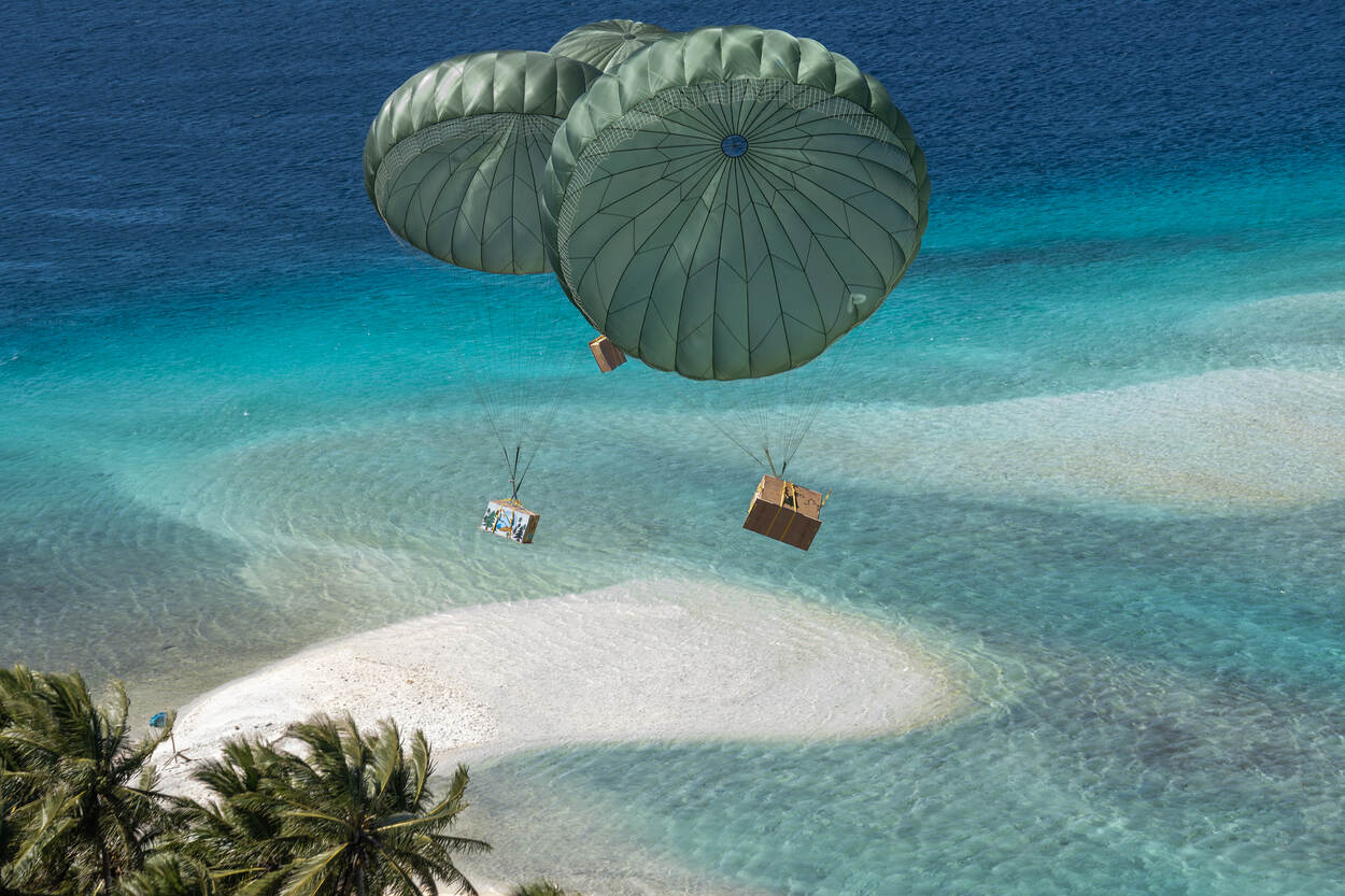 Vanaf een hoogte van driehonderd voet, zo’n honderd meter, vallen de ladingen dan op het strand of in het water. “Deze dropmethode vereist de nodige ervaring van de bemanningen omdat het afwerpen plaatsvindt met minimale gegevens van de drop-locatie en zonder contact met mensen op de grond.”