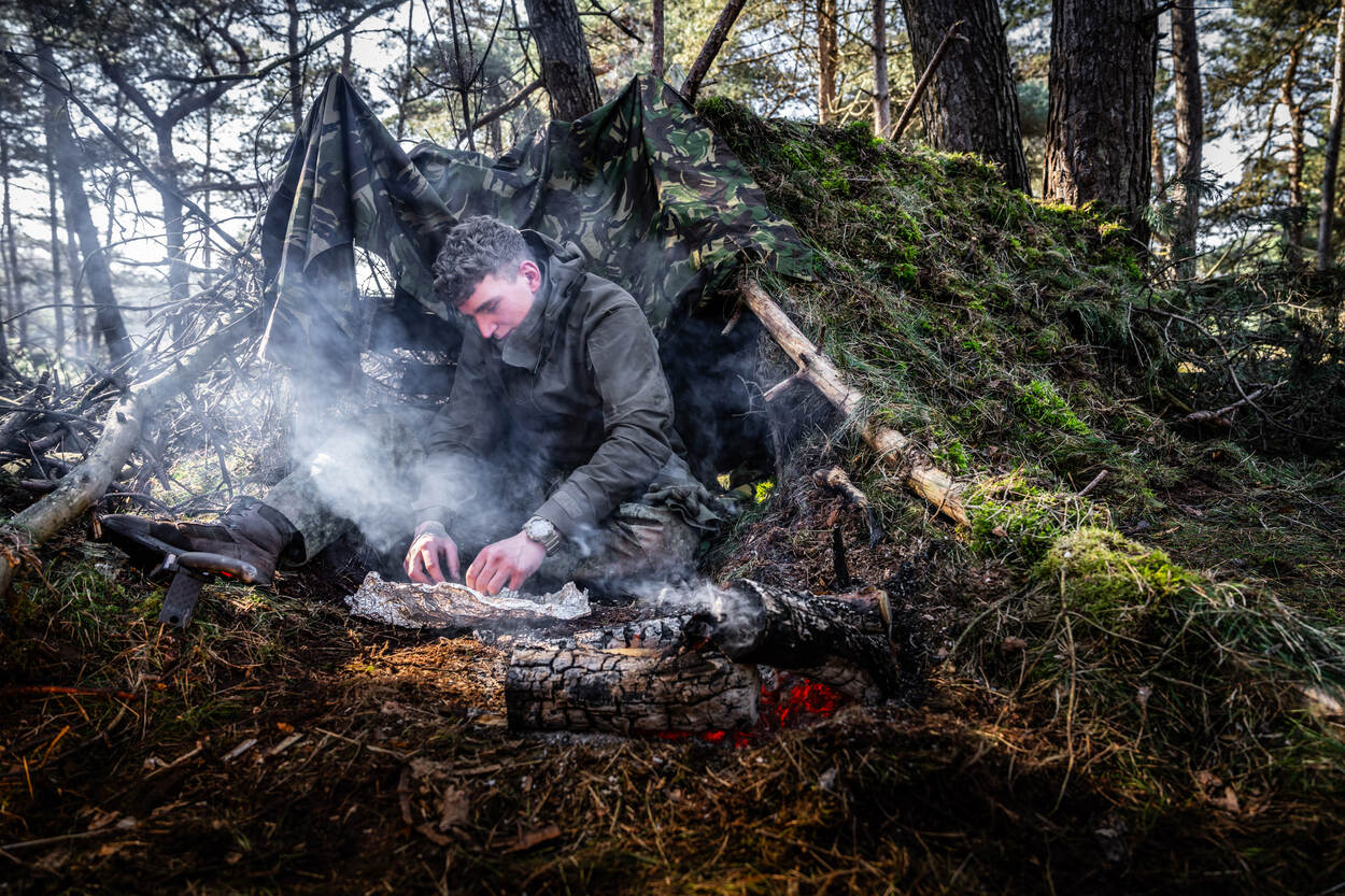 Korporaal 1 Wesley heeft het in zich. Tijdens het onderdeel overleven in de wildernis maakt de cursist niet alleen het best afgewerkte noodonderkomen. Doordat hij zijn shelter bedekte met een dikke laag mos heeft hij nog lekker geslapen ook. Ondanks dat het bos door de regen flink afkoelde en alles klam aanvoelde. En hoe smaakte de vis? “Best goed”, aldus Wesley. Om die te kunnen garen, verpakte de cursist zijn forel met mos in aluminiumfolie. “De hete kooltjes deden de rest.”