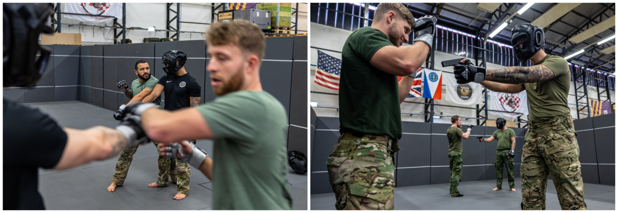 Wie bij een AMPT wil, moet tegen een stootje kunnen. Cursisten worden getraind in het aanleren van ontwapeningstactieken. Ook combative trainingen om de gevechtsbereidheid aan te wakkeren, horen erbij. Hiervoor staat in gebouw 408 op Vliegbasis Gilze-Rijen de zogenoemde dojo (zie foto's boven) ter beschikking. Dat is Japans voor een zaal waarin vechtsporten worden beoefend.