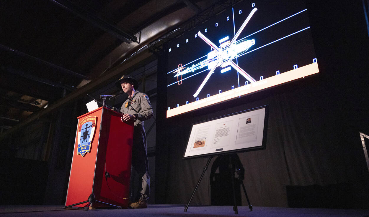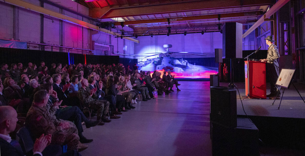 Als de zaal wat voller stroomt, komt adjudant Ron in actie. Iedereen krijgt een prachtige patch in handen of op de mouw geplakt, een blijvende herinnering aan capability launch. Even later begint de officiële capability launch met staatssecretaris Christophe van der Maat. “Met de Apache Echo betreden we een nieuw tijdperk in de luchtmacht”, zegt hij. “De eigenschappen van deze gevechtshelikopter zijn uitermate geschikt voor het veranderende karakter van onze dagelijkse operaties.” En hoe die zijn veranderd, stelt Commandant Luchtstrijdkrachten luitenant-generaal André Steur in zijn toespraak. “Er is meer in de wereld aan de hand dan alleen Oekraïne en het Midden-Oosten. We moeten kunnen laten zien dat we onder alle omstandigheden het luchtruim en grondgebied kunnen beveiligen. Daarvoor is dit toestel nodig. Er is onrust in de hele wereld en wij zijn ervoor om vrede en veiligheid te beschermen.”