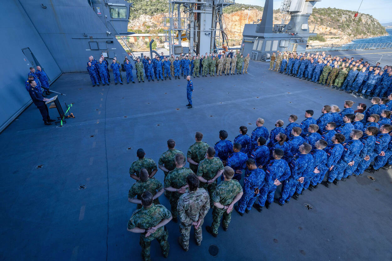 Baksgewijs op Zr.Ms. Karel Doorman tijdens Dodenherdenking. Onder de aangetreden militairen ook die van het Cougar-detachement dat aan boord staat. Foto: Defensie