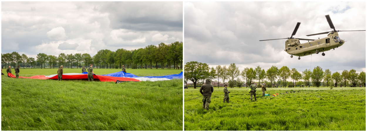 Maar het DHC heeft op Bevrijdingsdag nog een helikoptertroef in handen. Een bijzondere toevoeging van dit jaar is het vliegen van Chinook van 298 Squadron boven het bevrijdingsdefilé in Wageningen. De helikopter is afgezien van het kenmerkende geluid, qua beeld ook niet te missen, want eronder hangt een Nederlandse vlag van twintig bij dertien meter groot. Op deze manier laat de luchtmacht tastbaar en trots het nationale symbool vliegen boven de plek waar 79 jaar geleden de overgave van de Duitse bezetter werd getekend, wat de teruggave van onze vrijheid betekende.