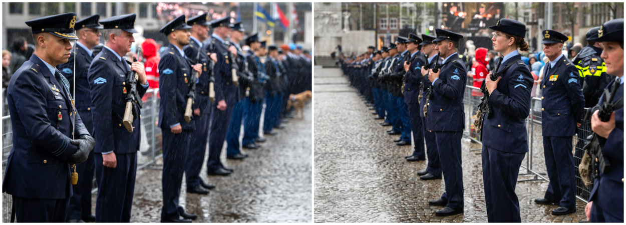 Zestig veteranen vormen op de Dam het erecouloir. Onder hen diverse actief dienende luchtmachters en militairen buiten dienst. Foto’s: Kick Smeets