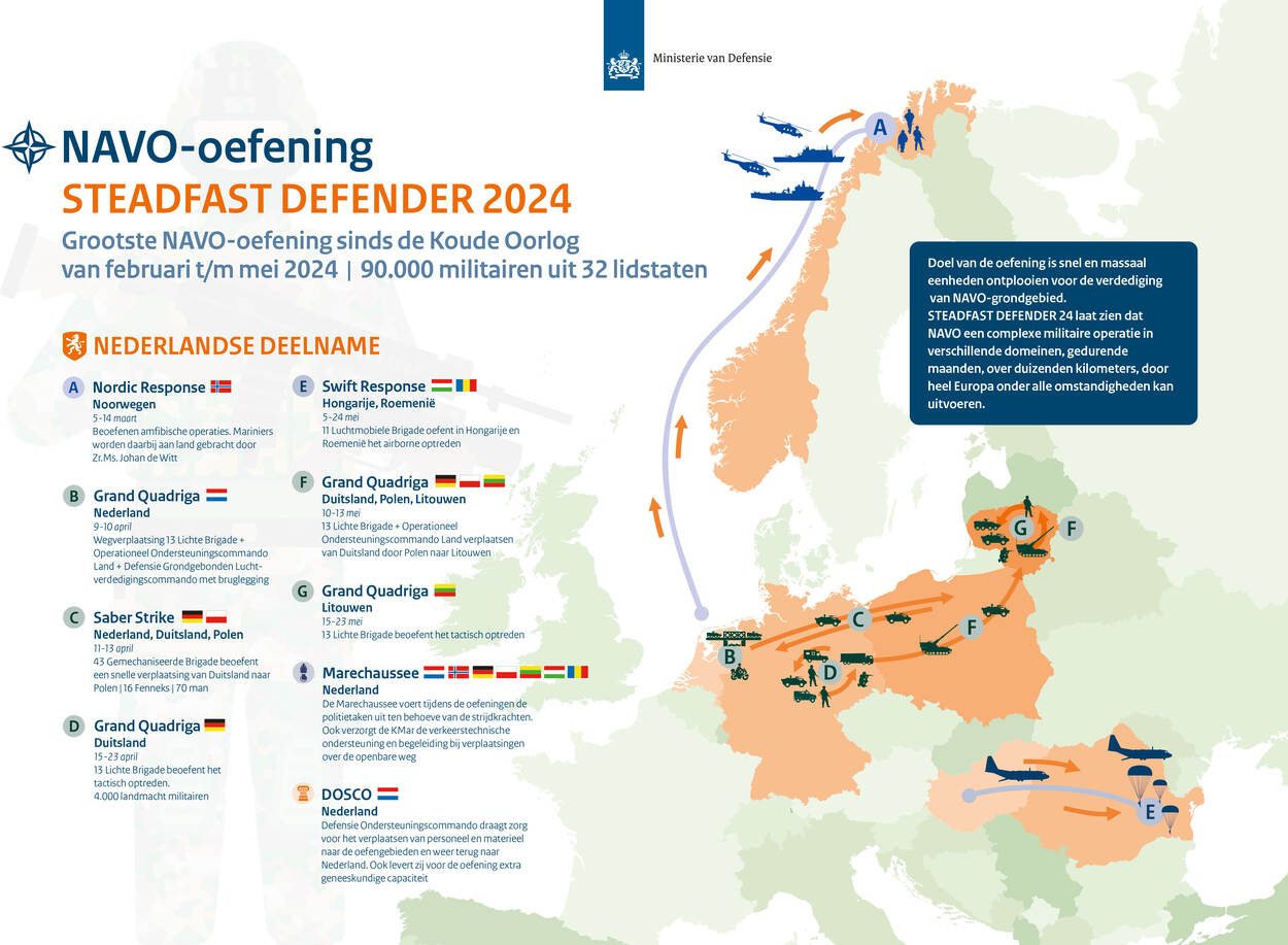 Steadfast Defender begon in februari en duurt tot en met mei. Het doel is te kunnen reageren op een aanval op een NAVO-bondgenoot. Over de gehele periode nemen 90.000 militairen uit 32 NAVO-landen deel. Nederland doet mee met ongeveer 4.500 militairen, 1.000 voertuigen, twee schepen en diverse vliegtuigen en helikopters. Met de oefening versterken de Amerikaanse en Europese krijgsmachten hun slagkracht en samenwerking.