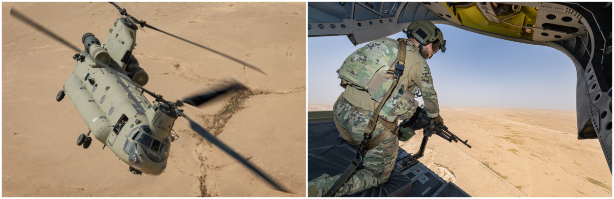 Een duo Chinooks pikt militairen op in de Iraakse woestijn. Oplettendheid geboden voor iedereen in de helikopter, dus ook de doorgunners.
