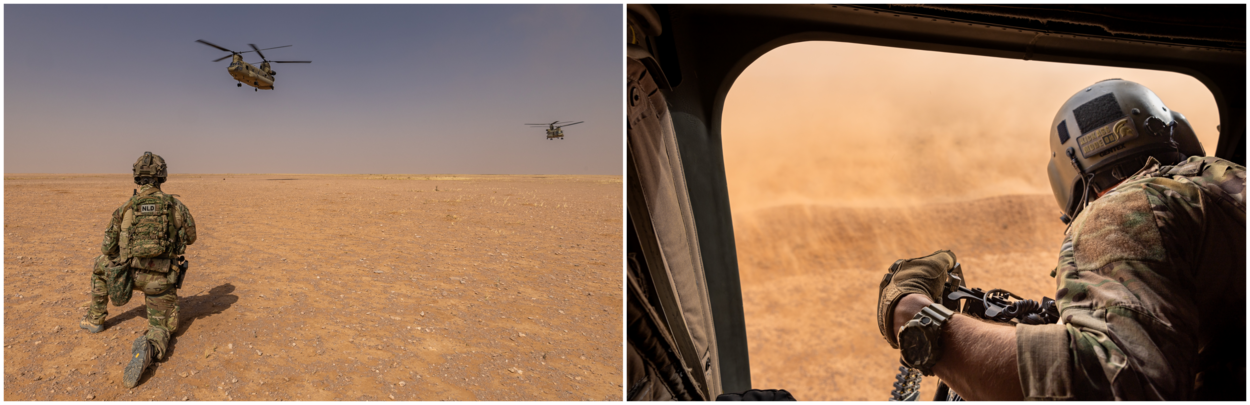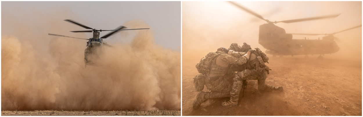Een enorme brownout door de downwash van de Chinook. In die stofwolk wachten militairen in een beschermende huddle totdat de helikopter weer vertrokken is.