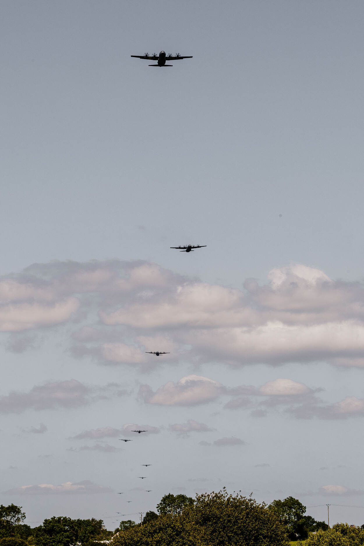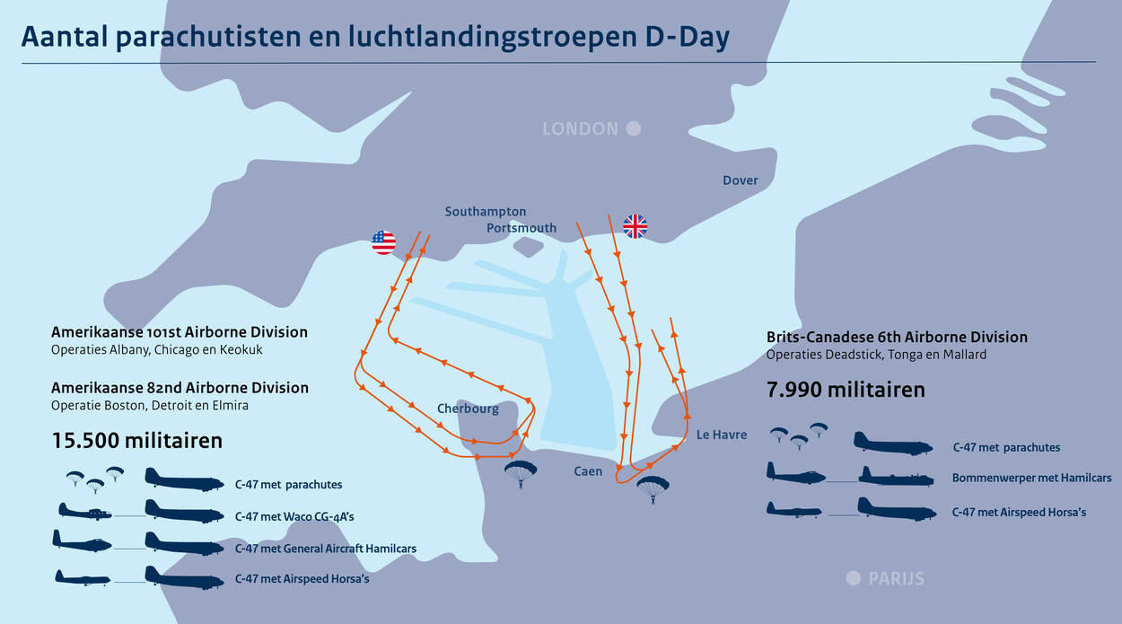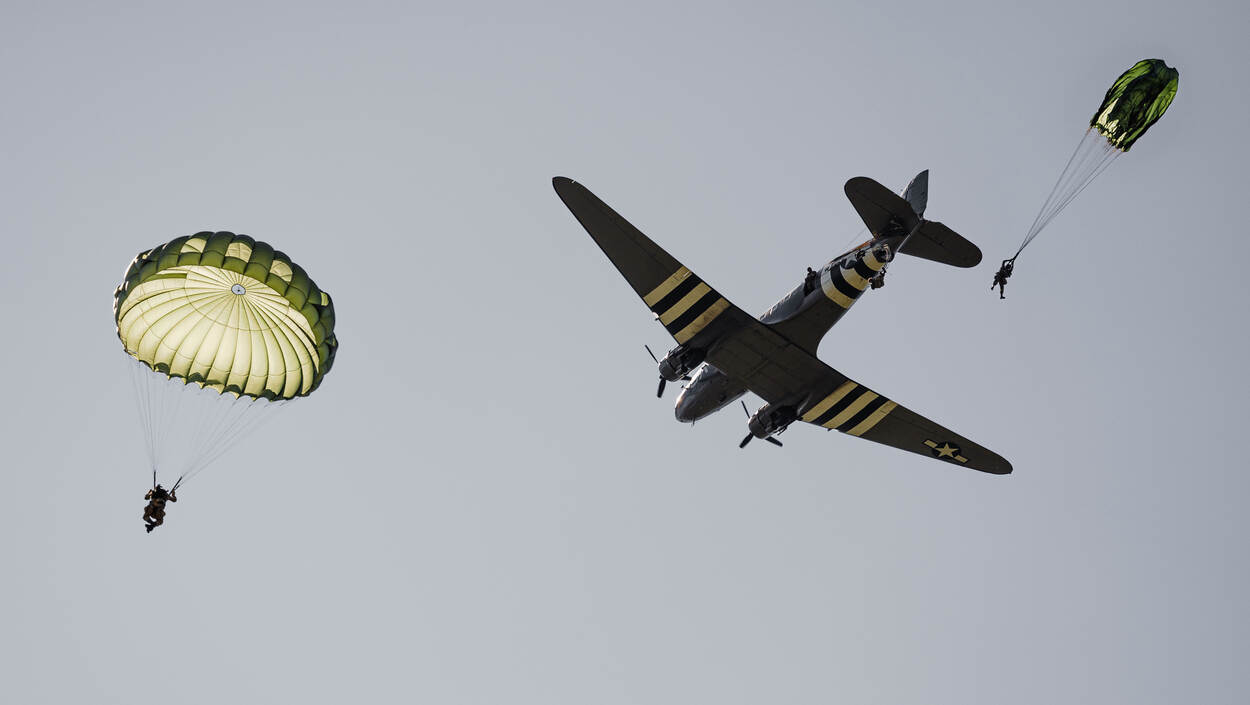 In grofweg twee vluchten, een Amerikaanse (west) en Britse (oost), brengen honderden transportvliegtuigen, bommenwerpers en gliders zo’n 23.500 parachutisten in de vroege ochtend van 6 juni 1944 naar Normandië De C-47 was een van de vliegtuigtuigen van waaruit in 1944 duizenden parachutisten sprongen. Ook bij de tachtigste herdenking was het werkpaard van WO II er weer bij.