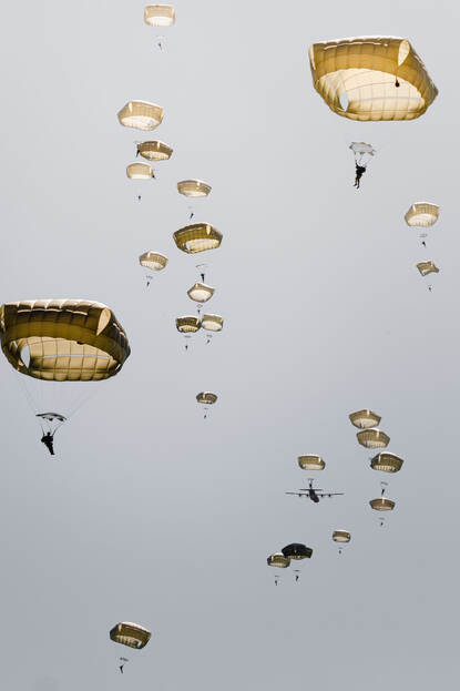 Parachutisten springen uit een van de Amerikaanse C-130’s. Na het overvliegen van de transportvliegtuigen is de lucht gevuld met parachutisten.