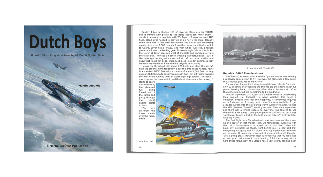 ‘Dutch Boys – Almost 150 exciting short tales by 62 Dutch Fighter Pilots’ met ISBN 978949000, is samengesteld door Martin Leeuwis en uitgegeven door Martin Leeuwis Publicaties. De softback op formaat 14,8x20,8 cm, telt 208 pagina’s en is voorzien van vele tientallen foto’s in zwartwit en kleur. Het boek kost slechts € 18,95 en daarvoor wordt het binnen Nederland nog gratis verzonden ook. Bestellen kan via http://www.jachtvliegers.info of kijk op https://www.leeuwispubli.nl.