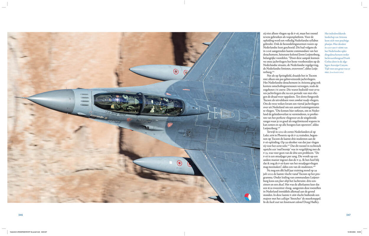 In 2003 pitchte luchtvaartjournalist en -fotograaf Frank Visser het idee al bij de luchtmacht: als de F-16 straks uit de dienst is, moet dit hét boek zijn. Een boek dat in driehonderd pagina’s zo volledig mogelijk de roemrijke geschiedenis beslaat. Dat zijn echtgenoot nog bij hem is mag naar eigen zeggen ‘een wonder’ heten, want inmiddels is het viertal auteurs – Visser en drie NIMH’ers – twintig jaar en bijna vijfhonderd pagina’s verder. “Het was een monsterklus en een aanslag op mijn vrije tijd, maar bij het eindresultaat voel ik heel veel voldoening.”