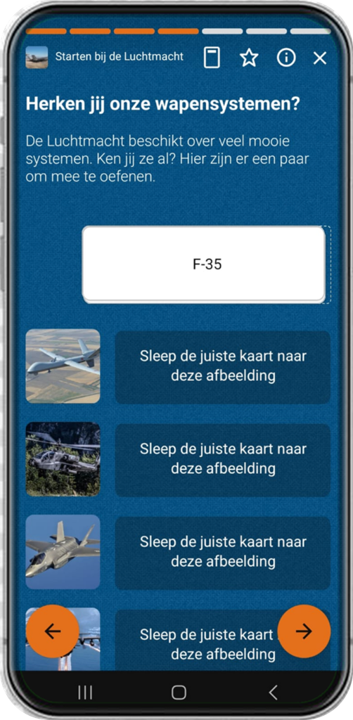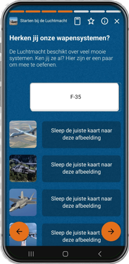 “Deze app is weer een klein bouwsteentje in het grote geheel om de personele gereedheid van de luchtmacht op orde te krijgen”, gaf de Directeur Personeel & Bedrijfsvoering CLSK aan. De app maakt onderscheid tussen startende militairen, burgermedewerkers en stagiairs. Voor elke groep staat een andere journey klaar. Die geven een beeld van wat een nieuwe medewerker van de organisatie mag verwachten, maar ook wat de organisatie van hem of haar verwacht. De preboardingapp neemt nieuwe collega’s onder andere mee in de defensieorganisatie, de cultuur, het gedrag en ongeschreven regels.