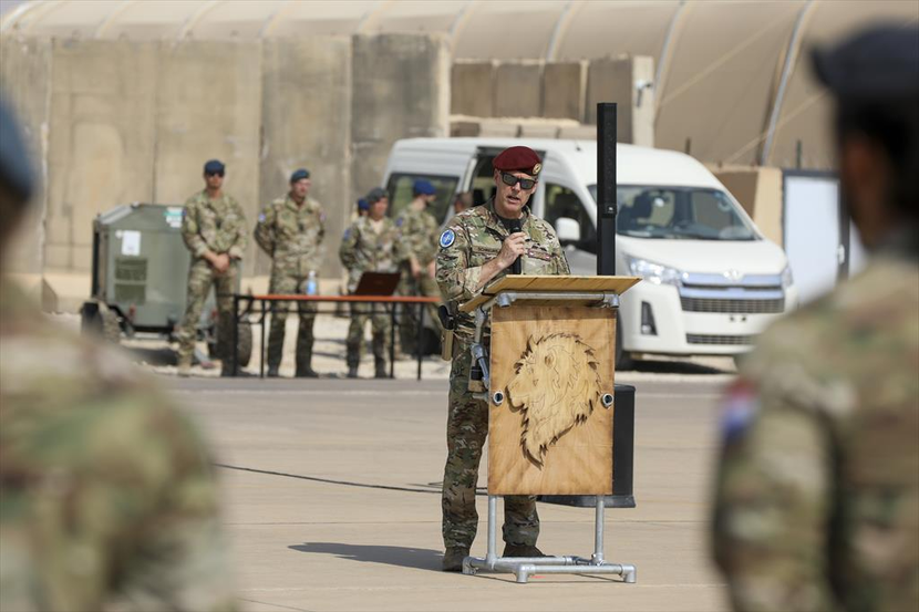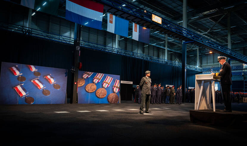 Tijdens de ceremonie stond het gehele detachement aangetreden op het platform. Luitenant-generaal Schreurs sprak van achter de lessenaar die is gecreëerd door de Gronduitrusting. Hij zei trots te zijn om de medaille te kunnen uitreiken. De generaal deed dat samen met de Senior National Representative, Ben, als detachementcommandant, en Ivo als chef-staf van de groep. Foto: Defensie