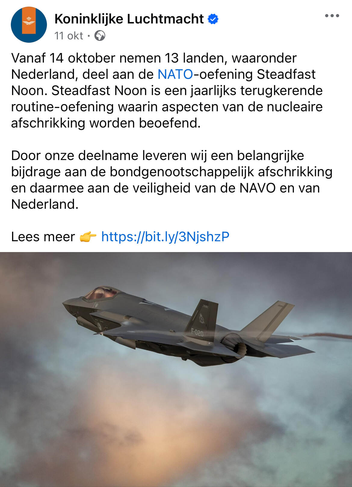 Vanaf 14 oktober nemen 13 landen, waaronder Nederland, deel aan de NAVO-oefening Steadfast Noon. Dit is de jaarlijks terugkerende routine-oefening waarin aspecten van de nucleaire afschrikking worden beoefend. Meer zien en lezen? Klik dan op deze link: