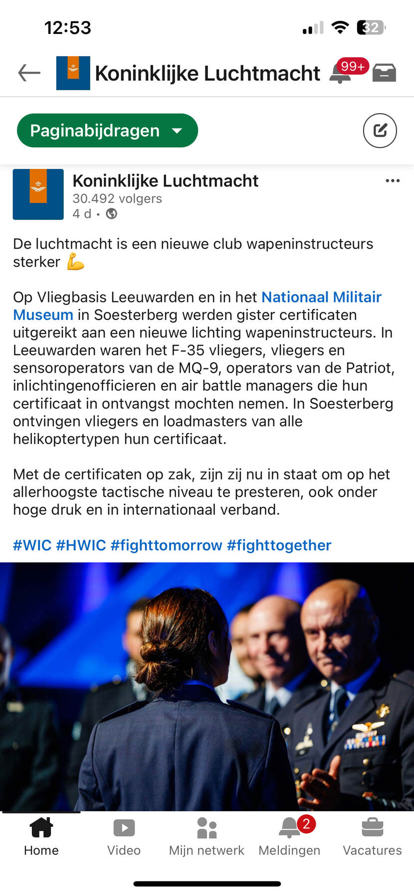 Op Vliegbasis Leeuwarden en in het Nationaal Militair Museum in Soesterberg werden de certificaten uitgereikt aan een nieuwe lichting wapeninstructeurs. Op Leeuwarden kregen F-35-vliegers, vliegers en sensor-operators van de MQ-9, operators van de Patriot, inlichtingenofficieren en air battle managers hun certificaat. Op Soesterberg ontvingen vliegers en loadmasters van alle helikoptertypen hun certificaat. Meer zien en lezen? Klik dan op deze link.