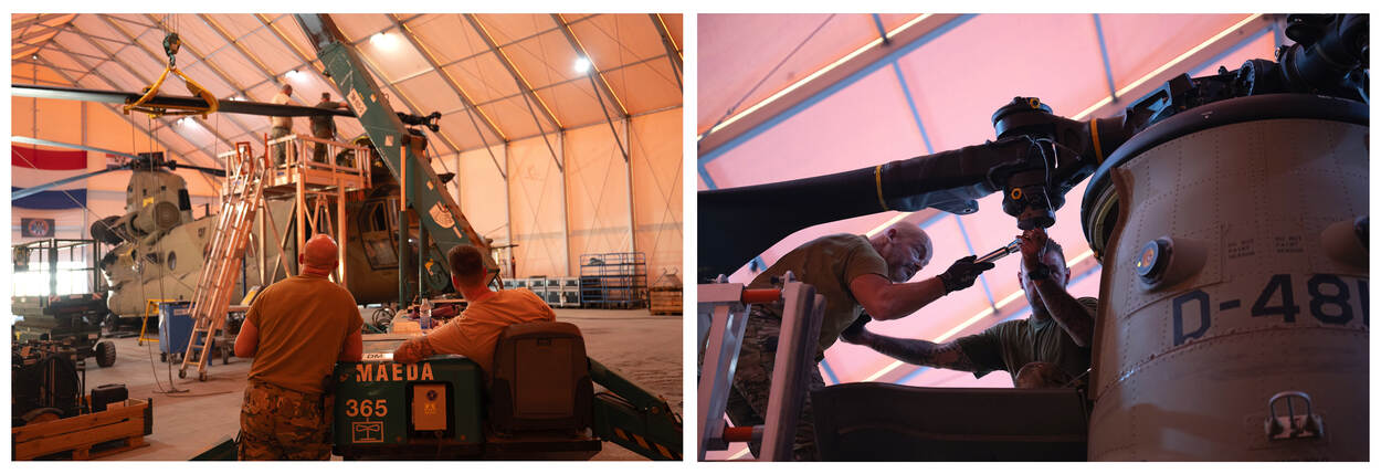 Hoofd Gereedstelling en Onderhoud (HG&O) kapitein Thomas en Toezichthouder Technische Dienst (TD) adjudant Peter beleven in december een drukke periode op Al-Asad Air Base (AAAB). Het duo is daar voor de NAVO-missie Irak (NMI). Dat hun dagplanning tijdelijk wat voller zit, heeft onder meer te maken met een ongebruikelijke klus die ze in december krijgen: het uitvoeren van de 320-uursinspectie van de Chinook.