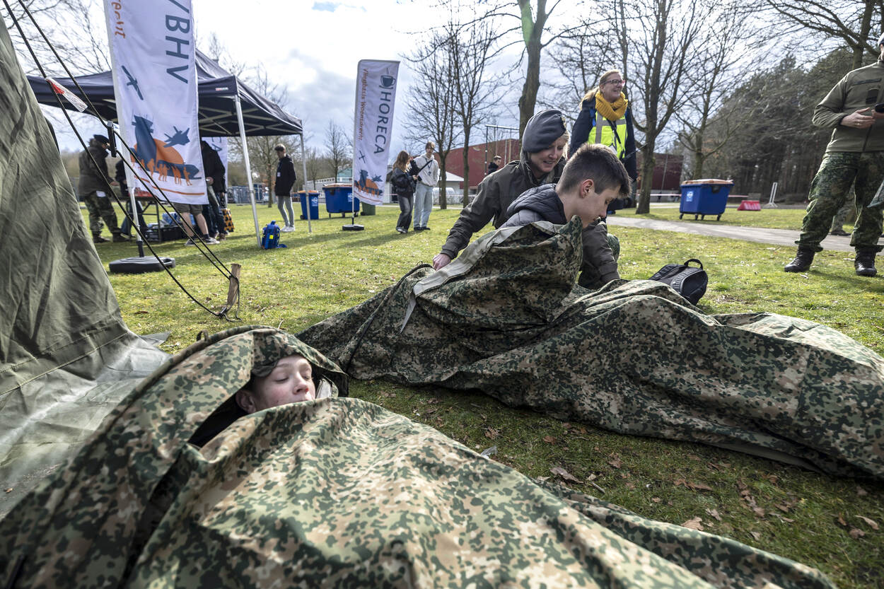 “Ik denk wel dat ik last van mijn nek krijg”, piekert een deelnemer hardop als hij de slaapzakken test. “Dan maak je van je jas een kussentje; denk in creatieve oplossingen”, reageert de instructrice op motiverende toon. Bij haar stand maken bezoekers niet alleen kennis met bivakuitrusting, maar ook met slapen in boogtenten en rantsoenen.