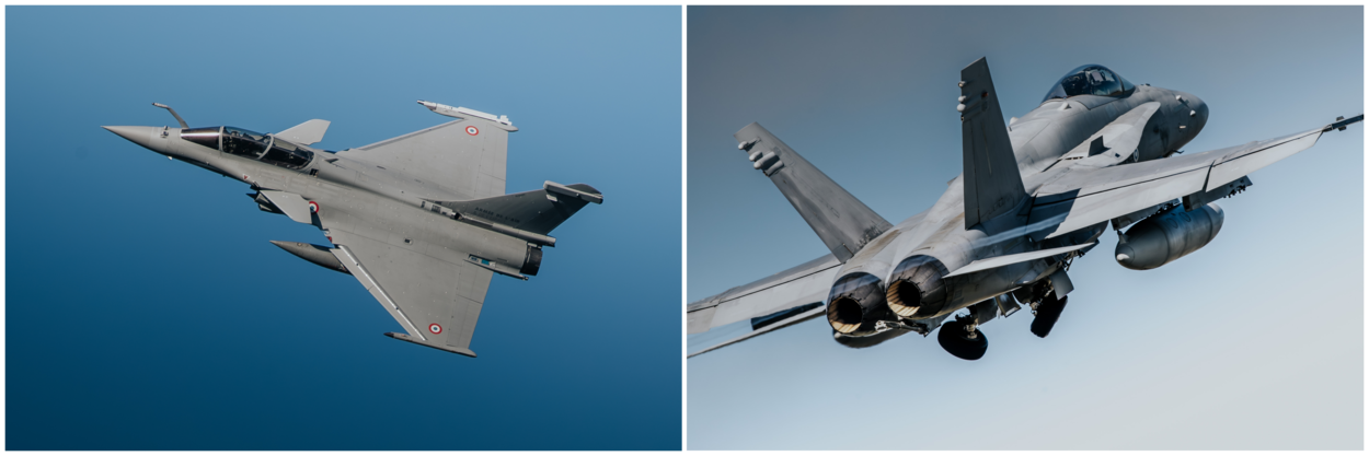 Links: De Franse luchtmacht stuurde deze keer alleen Rafale B-tweezitters naar Leeuwarden. Rechts: De Finse luchtmacht is met zijn F/A-18C Hornets geregeld te gast op Leeuwarden.