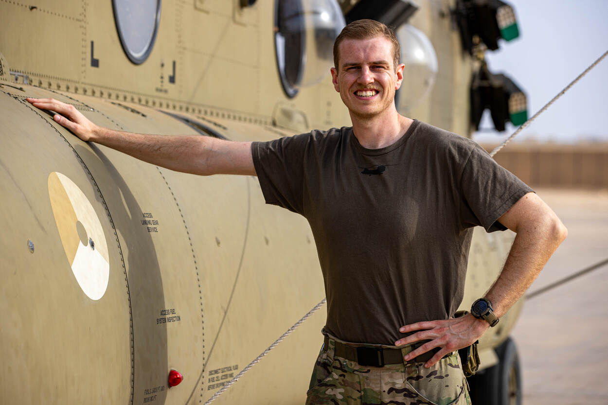 Simon heeft avionica als specialisme. Met andere woorden: alles wat met elektronica in de Chinook te maken heeft. Hij en zijn collega’s hebben een cruciale rol in het laten vliegen van de heli’s. In de woestijn is dat extra hard werken. “Zand, stof, veel zon: dat tast de kist sneller aan dan normaal. We maken veel uren en dat is eigenlijk alleen maar mooi”, zegt hij. “Deze missie is een droom die uitkomt. Mijn opa nam me vroeger al mee naar de Luchtmachtdagen. Sindsdien vind ik helikopters het mooiste wat er is. Het geluid, het militaire; het heeft iets machtigs.”