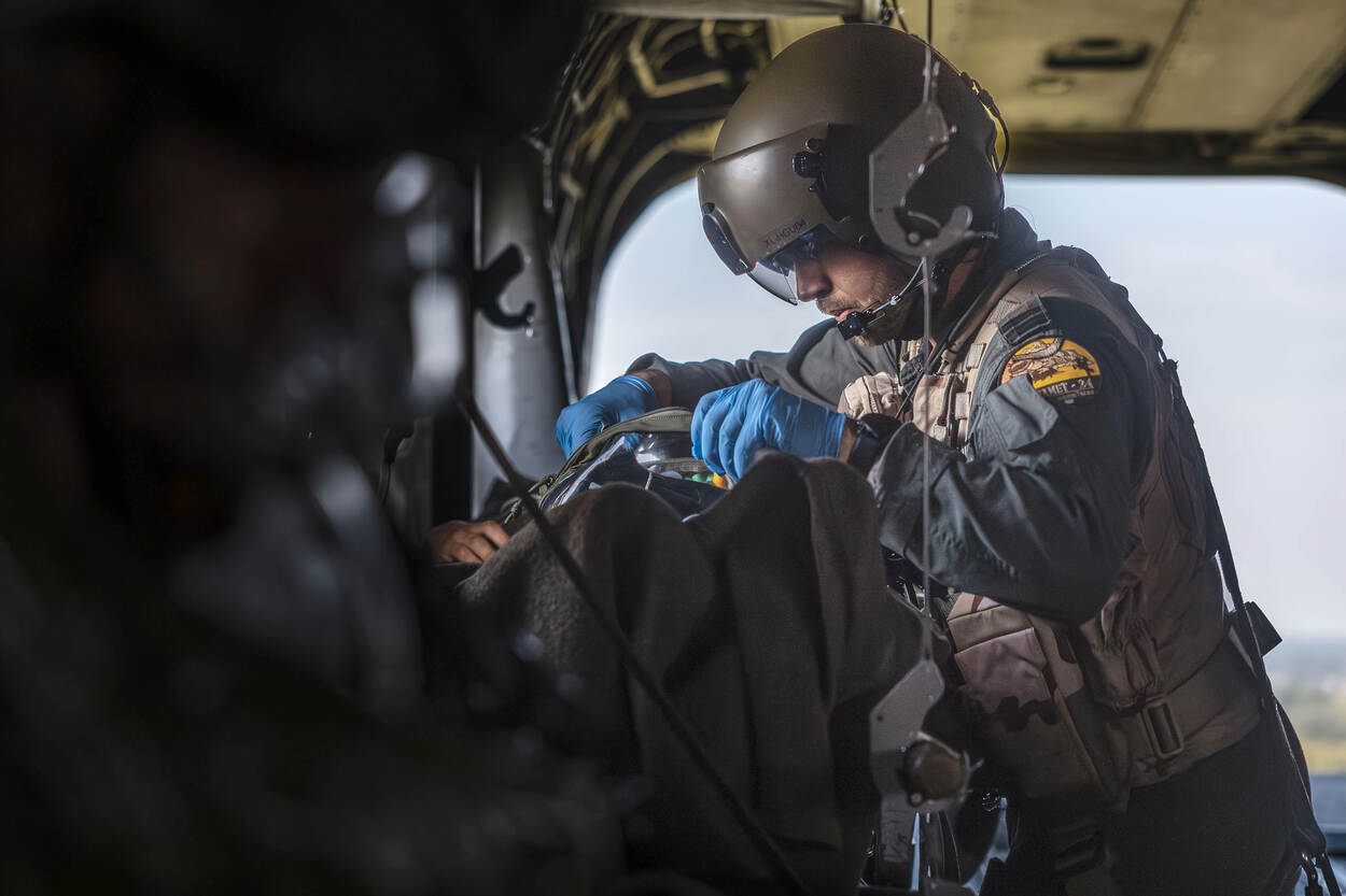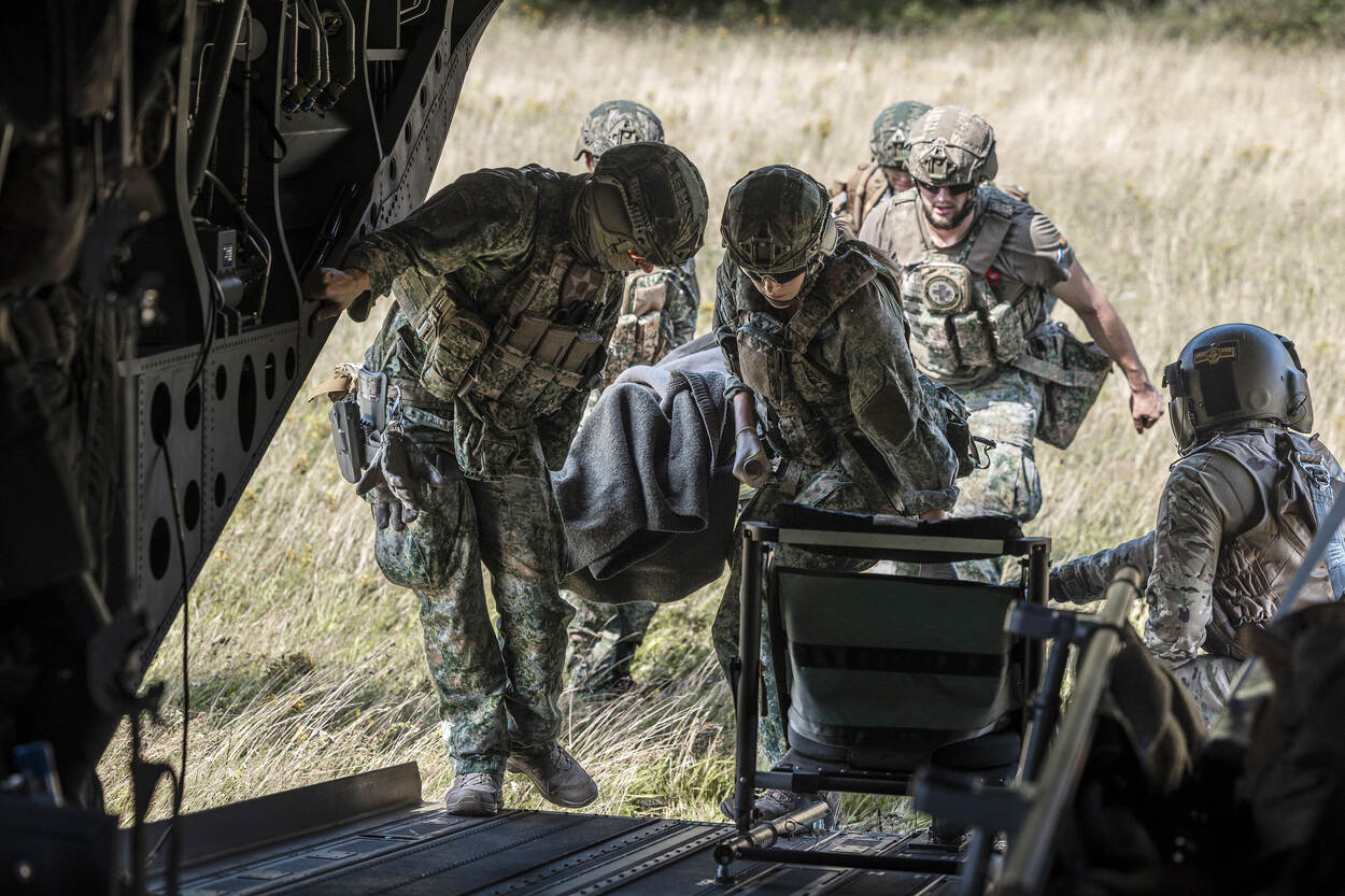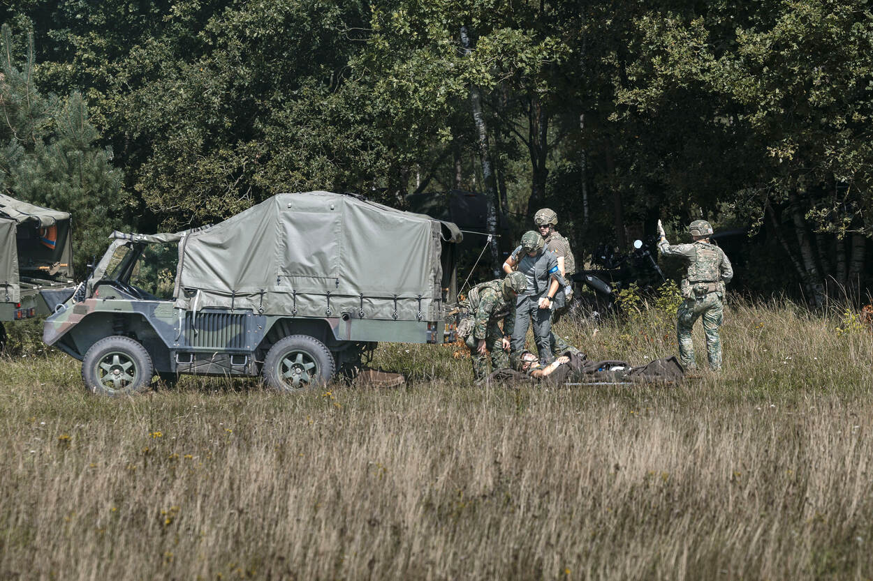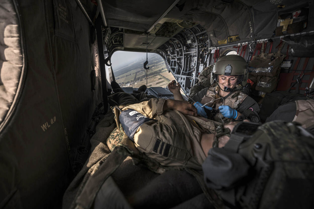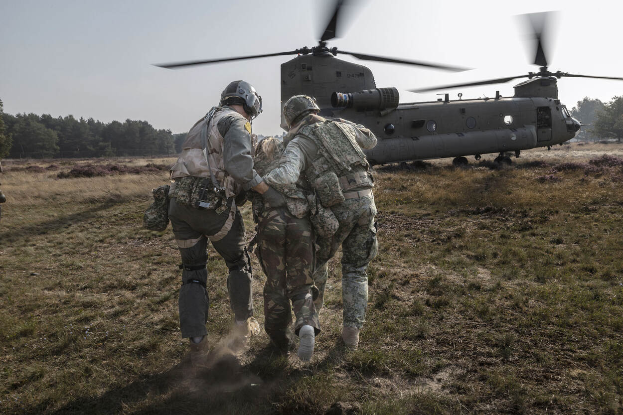 Voorbereiden op Hoofdtaak 1 betekent ook rekening houden met (oorlogs)gewonden. Het helpen, verzorgen en vervoeren van hen, de zogeheten operationeel geneeskundige keten, moet dan ook beoefend worden. Dat gebeurde van 11 tot 15 augustus tijdens de AE-trainingsweek, waarin land- en luchtmachteenheden de handen ineen sloegen. Want je kunt maar beter voorbereid zijn op een oorlogsscenario.
