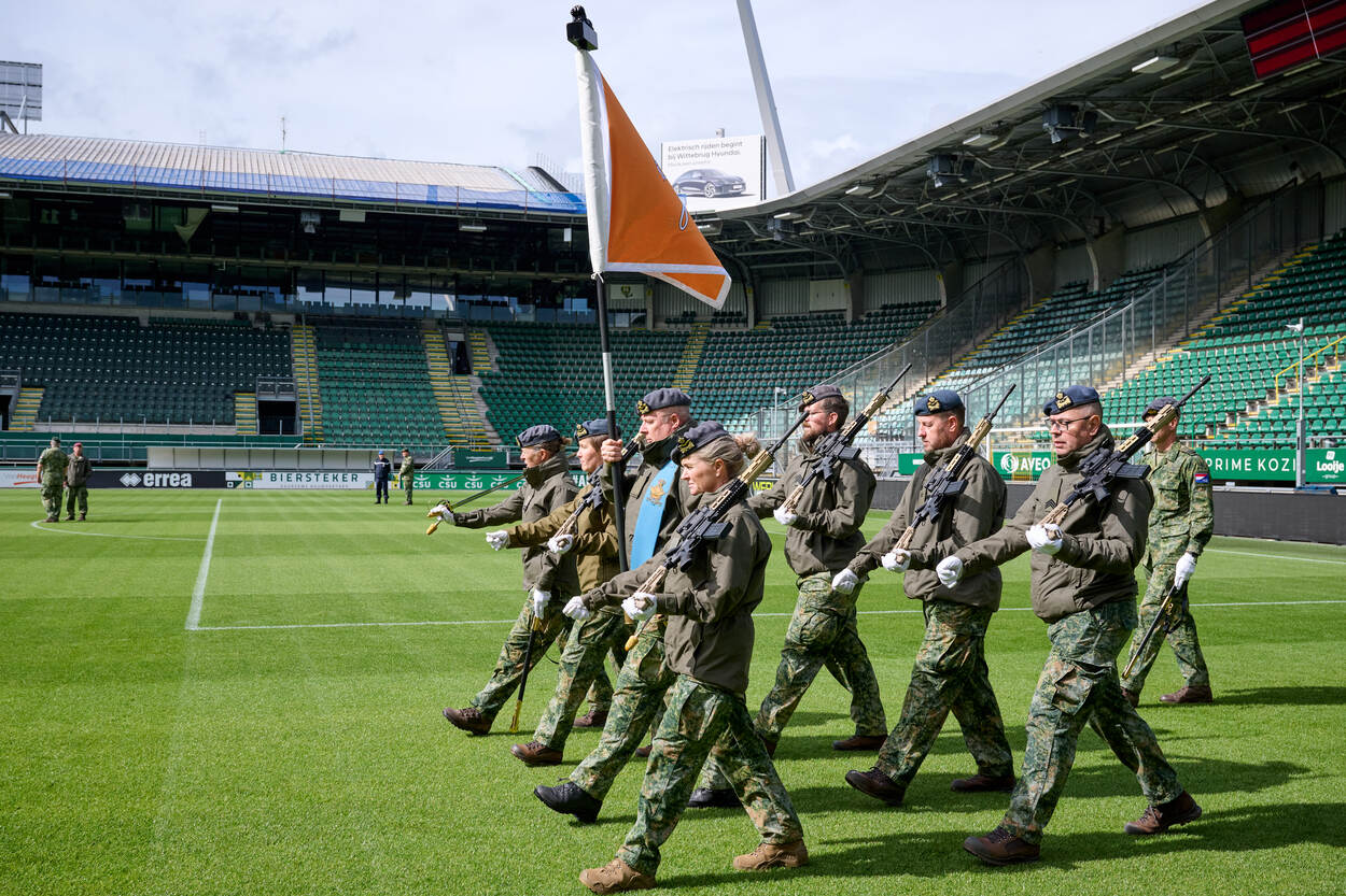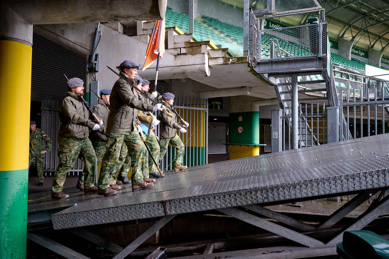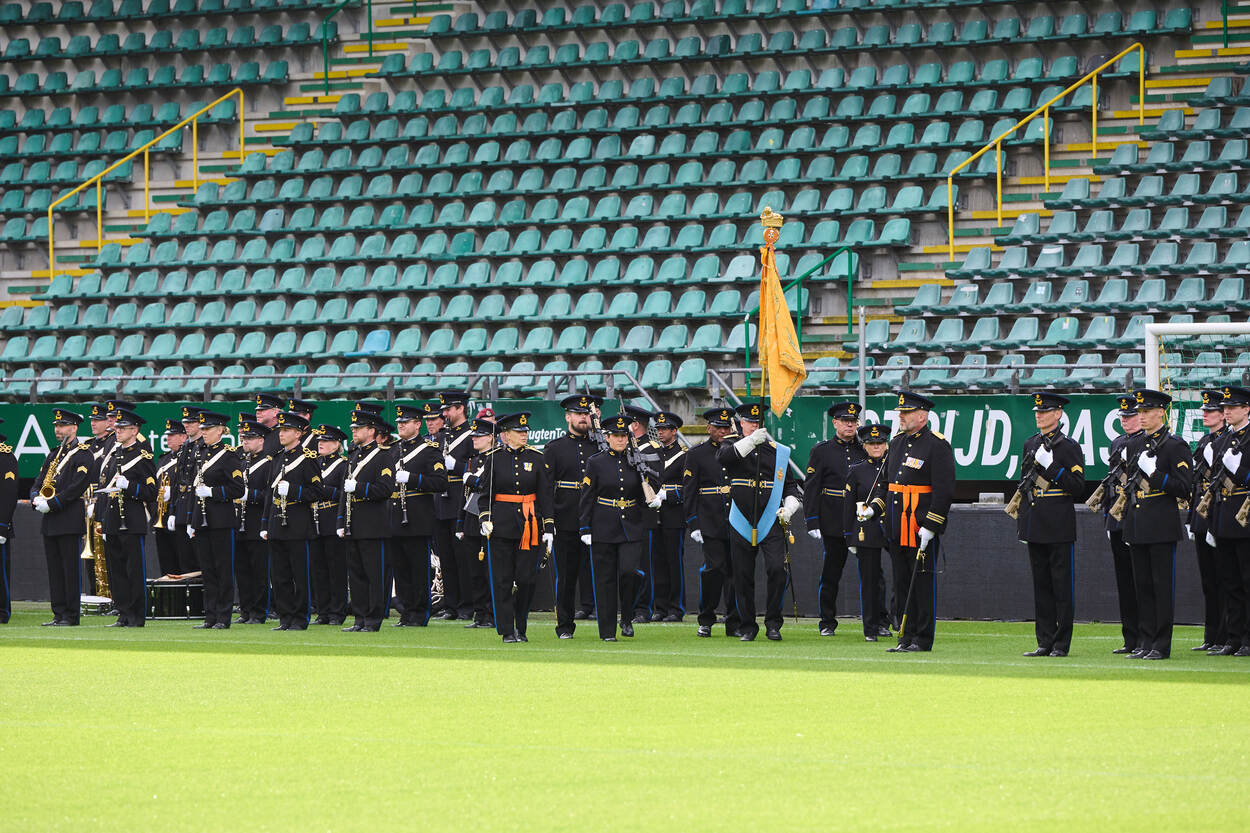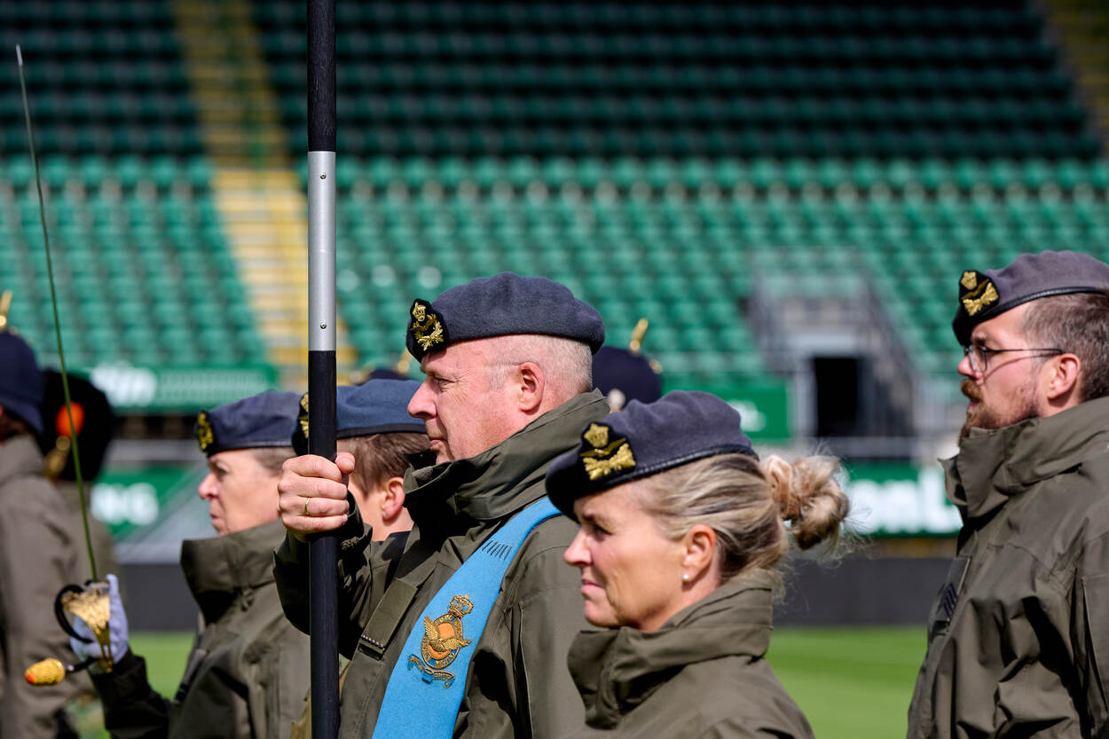 ‘Het vaandel is iets heiligs’, horen de aanwezigen tijdens de briefing in de supportersruimte. Over enkele minuten gaan de tientallen militairen het veld op met de vaandels van de verschillende krijgsmachtonderdelen. Strak in de pas en volgens vaste protocollen. Want, voordat het vaandel op Prinsjesdag met de troepen mee mag naar het centrum van de Hofstad, moet de vaandelwacht ‘intreden’. Een gebruik waarbij deze zevenkoppige groep aansluit bij de rest van de militairen. Vanaf dat moment valt de vaandelwacht onder bevel van de Commandant Erewacht. En precies dat stukje beoefenen de aanwezigen in het stadion.