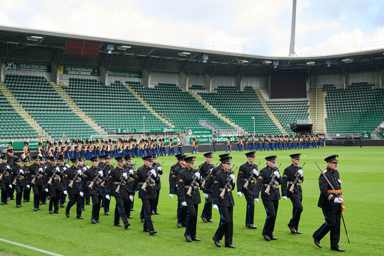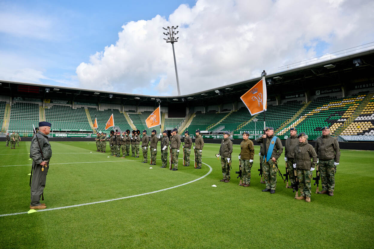 Een goede uitvoering vergt een strakke voorbereiding. Enkele dagen voor Prinsjesdag kwam een groep militairen daarom samen in het stadion van voetbalclub ADO Den Haag. Op de speelkalender: de generale repetitie voor het intreden van de vaandelwachten. Ook de luchtmacht gaf acte de présence en het resultaat mocht er zijn.