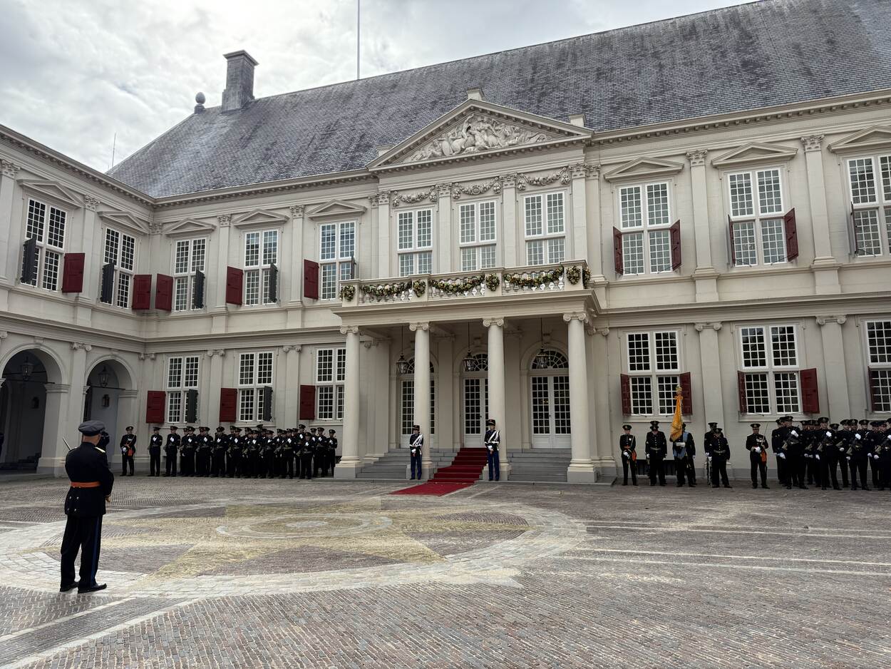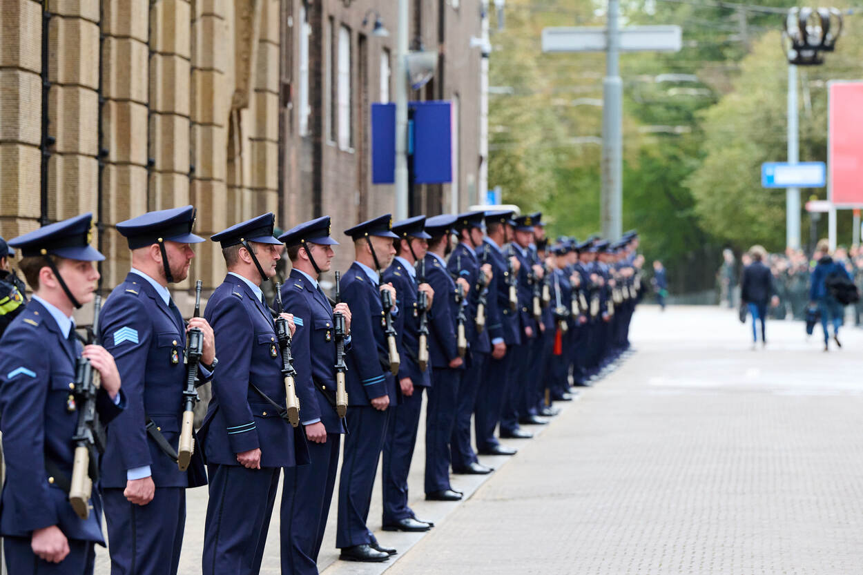 De vaandelwacht van de luchtmacht staat overigens niet alleen binnen de hekken van het werkpaleis van de koning. Naast hen staat een detachement van de Groep Luchtmacht Reserve (GLR). Aan de andere kant van het bordes staat een wat groter detachement van de Staf Commando Lucht- en Ruimtestrijdkrachten en weer daarnaast bevindt zich het Orkest Koninklijke Luchtmacht. Alles bij elkaar opgeteld zo’n 120 luchtmachters. Samen vormen zij de Erewacht Paleis Noordeinde. Zij zijn op hun beurt weer onderdeel van de ruim 2.000 militairen, veteranen en studenten die namens alle defensieonderdelen vooral ceremoniële rollen vervullen tijdens het evenement.